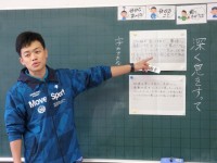4年生の2時間目は理科の授業でした。2けたで割るわり算の学習です。先生が3つも問題を黒板に書きました。どの問題も紙が「126枚」、「18枚」と「7つの班」の数字のどれかが入っていますが、少しずつ問題の内容が違います。まずは、3つの問題を見て「今日の課題は何か」を予想しました。予想通り、問題の解き方を考えるというものでしたが、いつもとやり方が違います。班ごとで1問ずつ解き方を話し合いながら考えます。その後、班で分担して「他の班に違う問題の解き方を聞きに行く人」と「自分たちが解いた問題のやり方を説明する人」に分かれます。自分たちが解いた問題のエキスパートとして、他の班からやってきた人にやり方を説明します。他の班に聞きにいった人は、自分の班に戻ったら、班の人に聞いてきた別の問題の解き方を説明していきます。「考える」「聞く」「説明する」がたくさんある授業でした。
