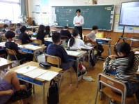 3年生の3時間目は国際科の授業でした。「What color do you like?」という質問に答えたり、逆に嫌いな色を伝えたりする活動を行っていました。質問に答えたら、まわりの人が「Really?」や「Good!」などで相づちを入れることもできました。質問に答えたら1~50までの番号を言うと、そこに隠された得点が表示されます。「高得点出て!」と祈っている子がいました。