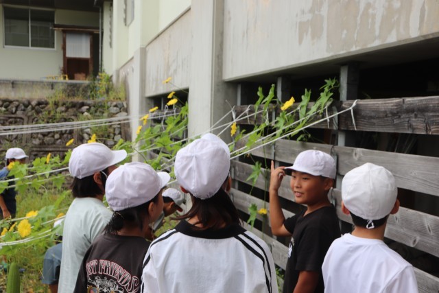 実際に「ヘチマ」と「アサガオ」の花のつくりを観察して確かめていました。