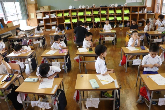 4限、1年生は学活で、「2がっきのめあて」を書いていました。