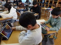 5年生の3時間目は算数の授業でした。図形の学習です。「四角形の4つの角の大きさの和は360度になるのか」を考えました。長方形や正方形の場合は90度が4つなので、360度になることは分かりますが、90度の角が一つもないいびつな四角形ではどうなのかを実物を操作して考えました。図形を切ってつなげたり、4枚用意してつなげたりして360度になることを確かめました。また、「三角形の角の和は180度」ということを使って、四角形の角の和を確かめることができるのか、近くの人と話し合いました。