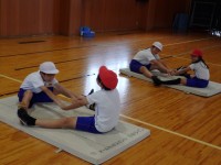 4年生の2時間目は体育の授業でした。ウォーミングアップで「助けオニ」と「片足手押し相撲」をした後、ハードルの学習です。ハードルとハードルの間を少しずつ離した3つのコースで、自分で選択して練習しました。ハードル間には足を着く目印が4つずつ置いてありました。4歩でハードルを越えていく練習です。みんな上手に4歩でリズムに乗ってハードルを駆け抜けていました。