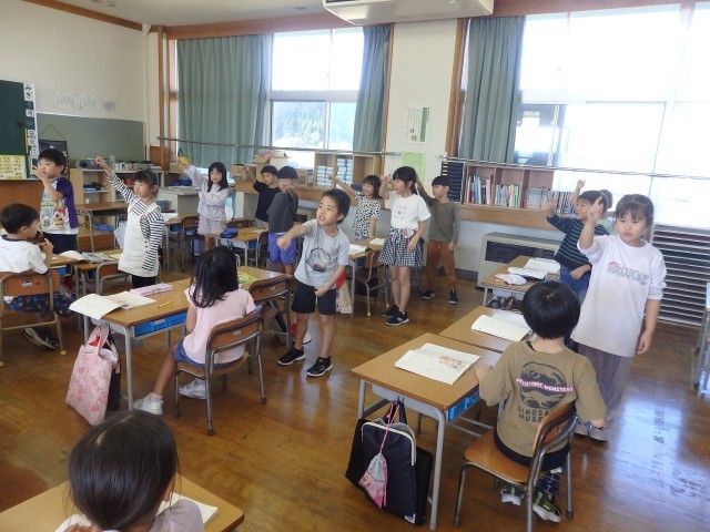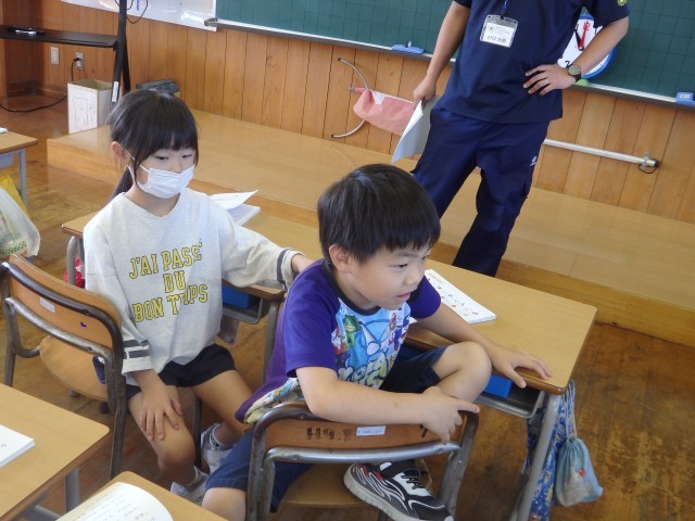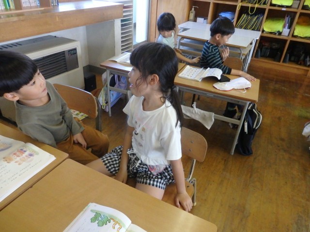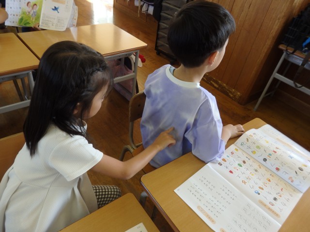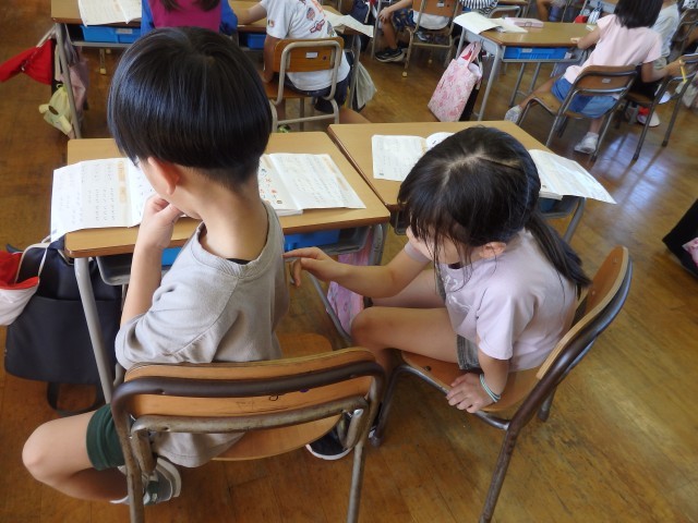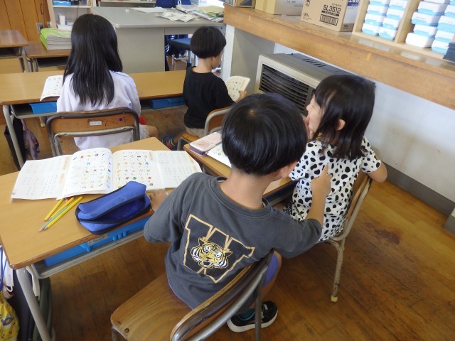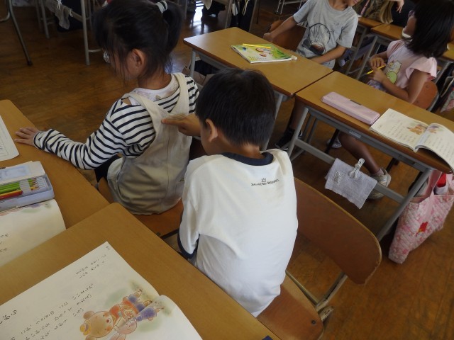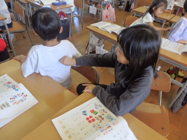 昨日30日の5時間目、1年生の5時間目は国語の授業でした。カタカナの学習です。まずは半分ずつに分かれて、先生が言うカタカナを空書きして見せ合い、書けているかどうか確かめました。その後、隣の人とペアで背中に書かれたカタカナが何か問題を出し合いました。