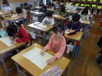 1年生の3,4時間目は図工の授業でした。まずは3時間目の様子です。画用紙にクレヨンで模様を描いていました。直線や円や渦巻きなどを組み合わせて描いたり、トントントンと点を打つようにしていろいろな模様を描いていました。
