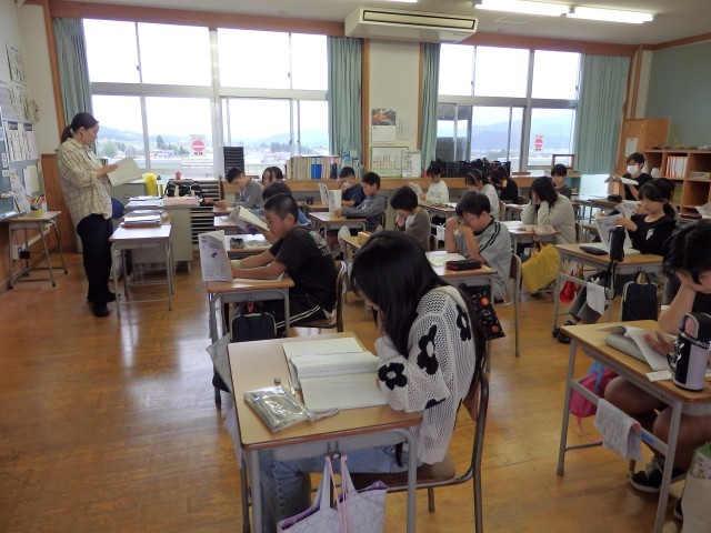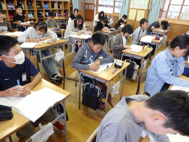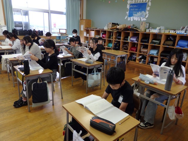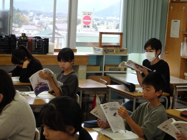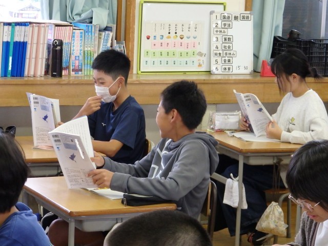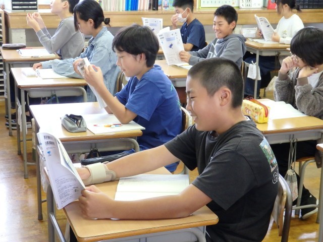 6年生の1時間目は国語の授業でした。「永遠のゴミ プラスチック」の学習です。まずは1人ずつ丸読みで音読していきました。その後、評論文の中心である本論の部分はどんなことが書かれているのかを段落ごとに読み取っていきました。「影響」などの難しい漢字や聞いたことがない「マイクロプラスチック」がどれくらいの大きさなのかも確かめていました。