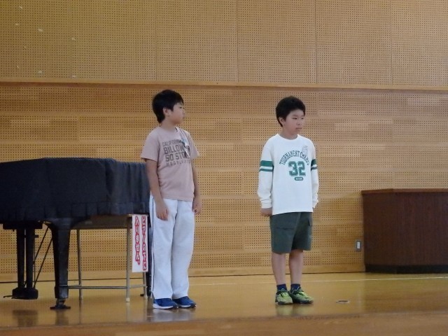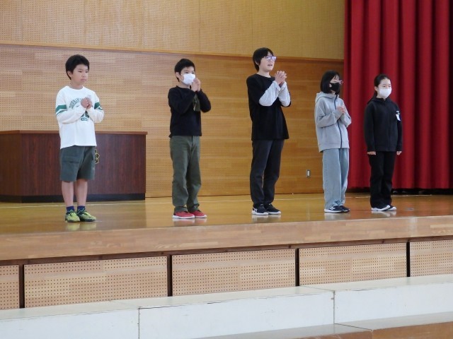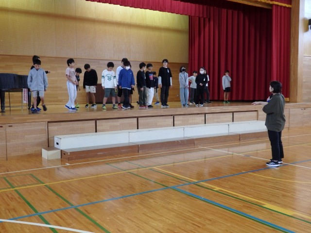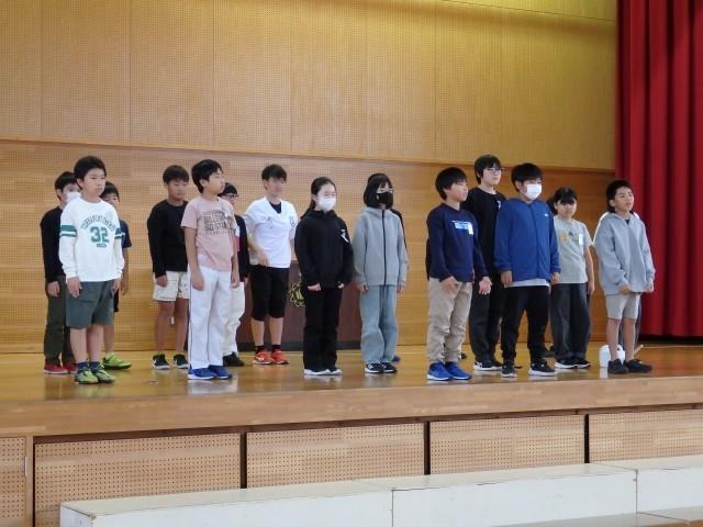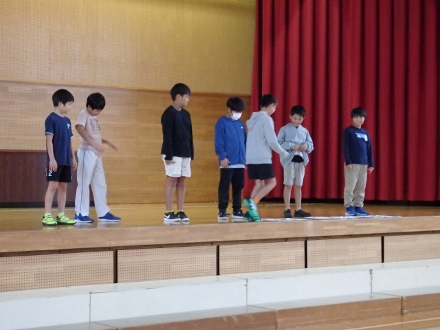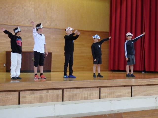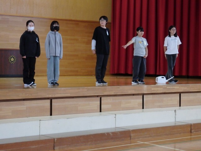 5年生の1時間目は学習発表会のステージ練習でした。朝活動の時間に5,6年生が音楽室から楽器を運んだり、ステージ前の台を設置したりしてくれました。ありがとう!今日から各学年にステージ練習が割り当てられました。5年生は小道具も使って実際に動きながらの通し練習をしました。もう自分のセリフをしっかり覚えていたのはさすがです。
