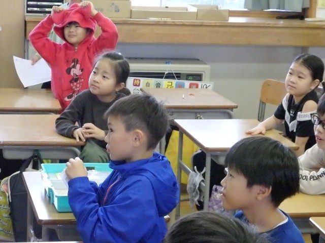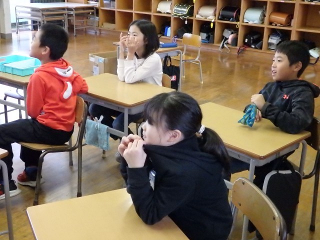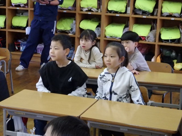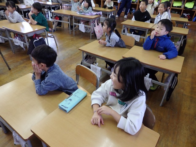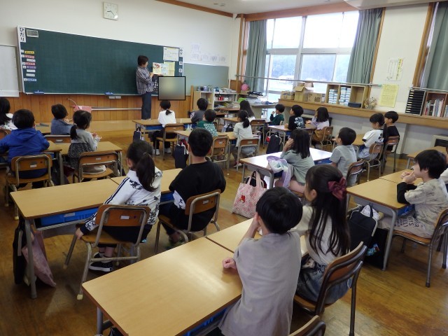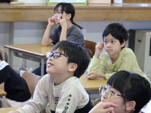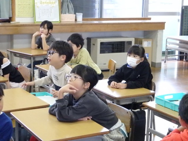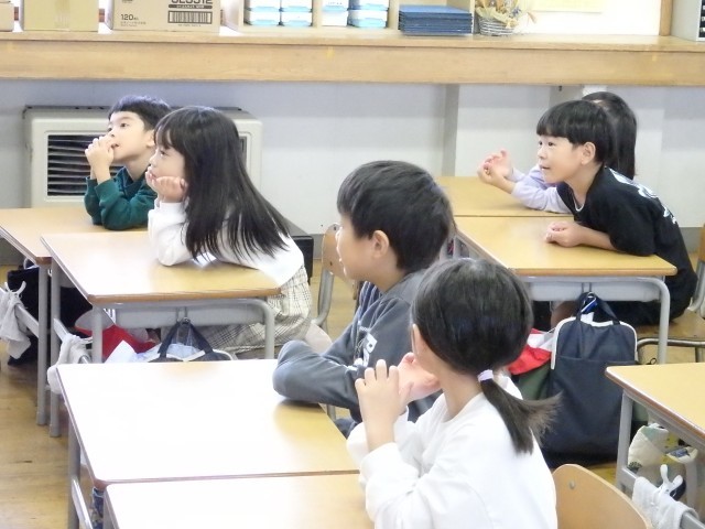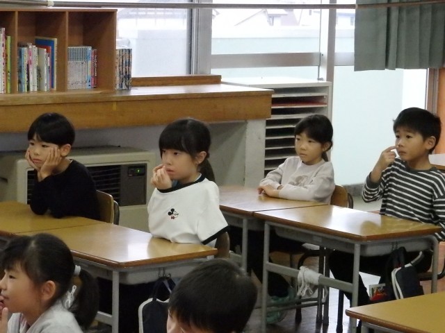1,2年生の朝は読み聞かせを行いました。身を乗り出して絵本の世界に没頭している子がいました。
