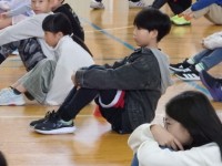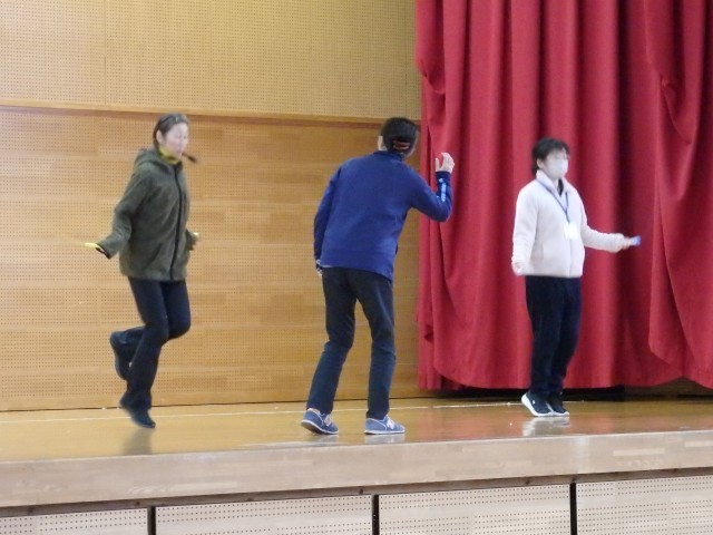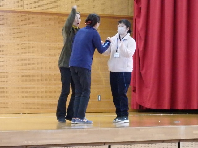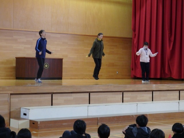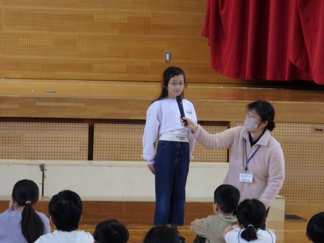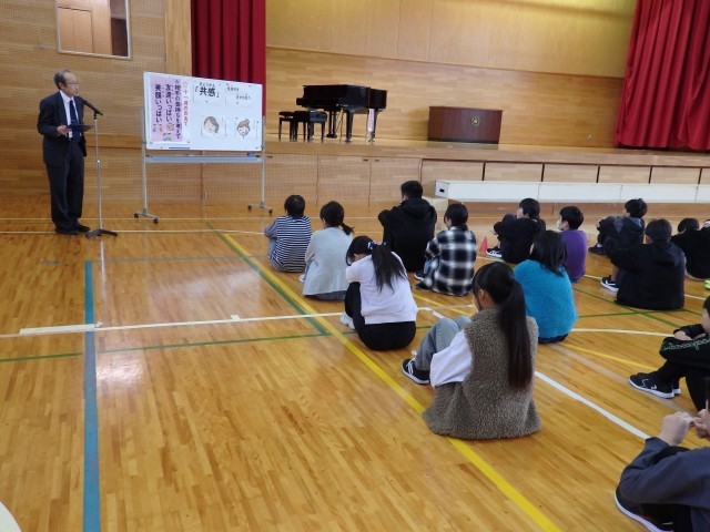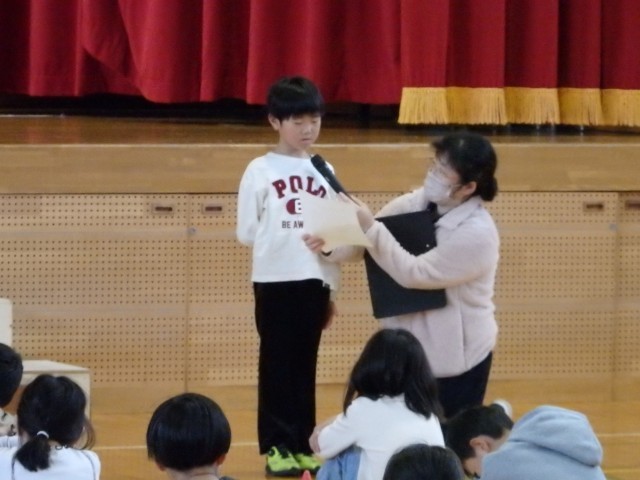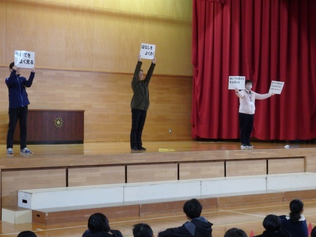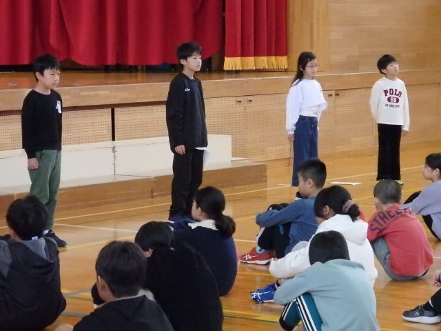 その後、11月の生活目標「相手の気持ちを考えて 友だちいっぱい、笑顔いっぱい」について生活指導担当の先生が話しました。また、縄跳びを練習している場面で、目標100回が達成できたのに、知らんぷりしている場面と一緒に喜んでくれる場面を先生たちが劇をして、「共感」ということばについて考えました。