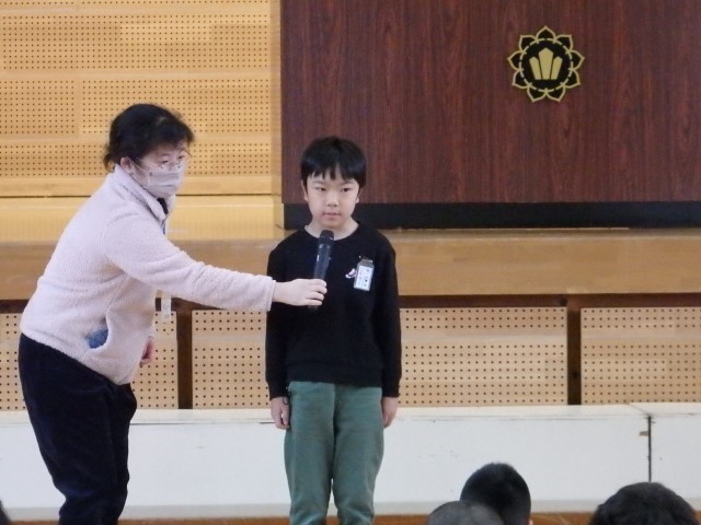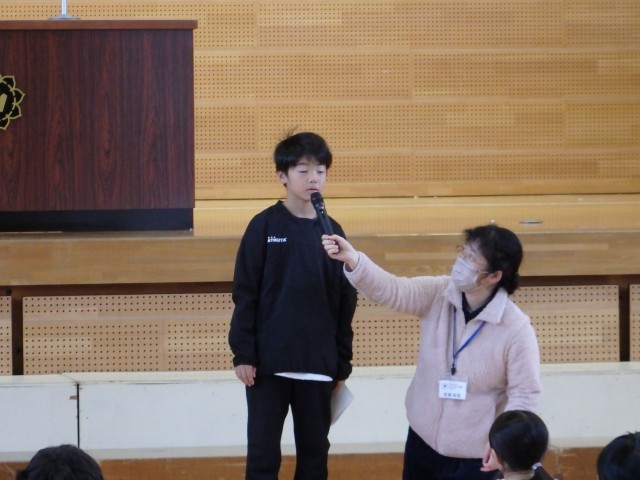 今朝は生活朝会でした。まずは10月の生活目標「きまりを守って落ち着いて生活しよう」に対しての振り返りを2,3,4,6年生の代表の子たちが発表してくれました。今月は生活目標に対して【学級のめあて】を話し合って決め、その達成に向けて取り組んできました。それぞれの代表の子たちが「自分の振り返り」だけでなく、「クラス全体の振り返り」も話してくれました。