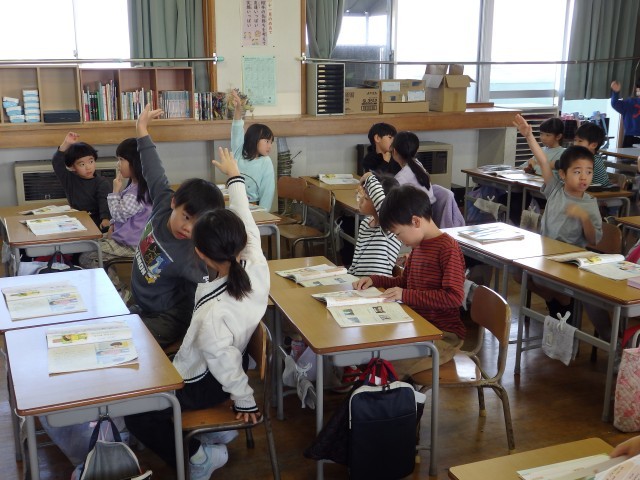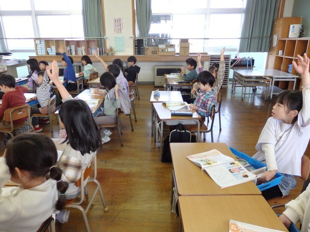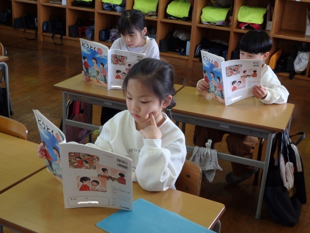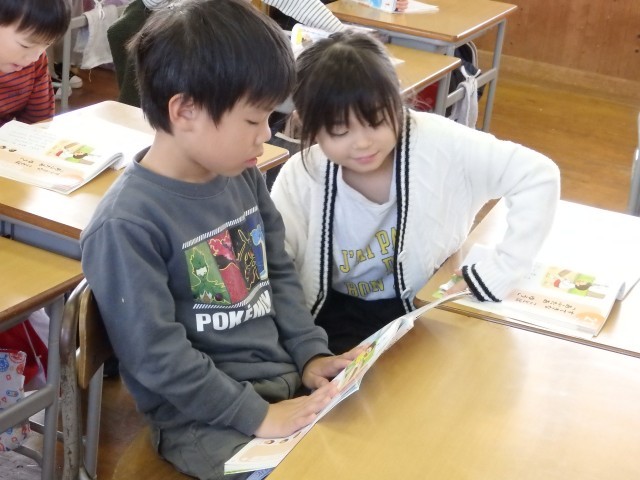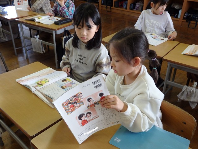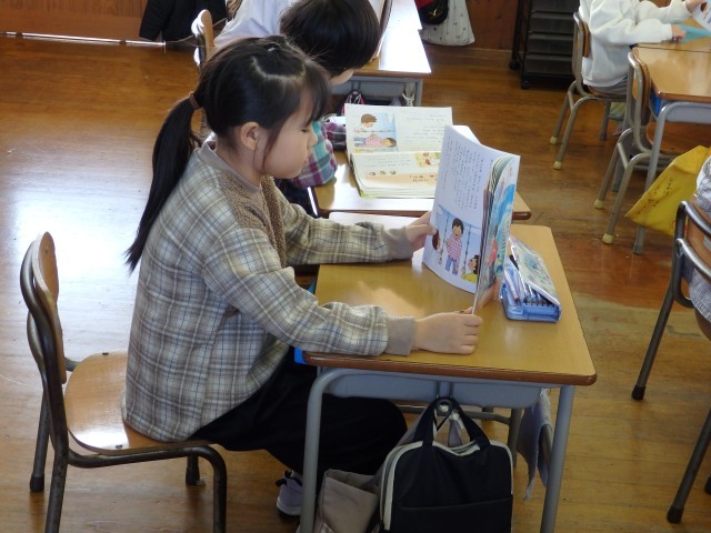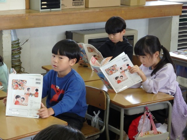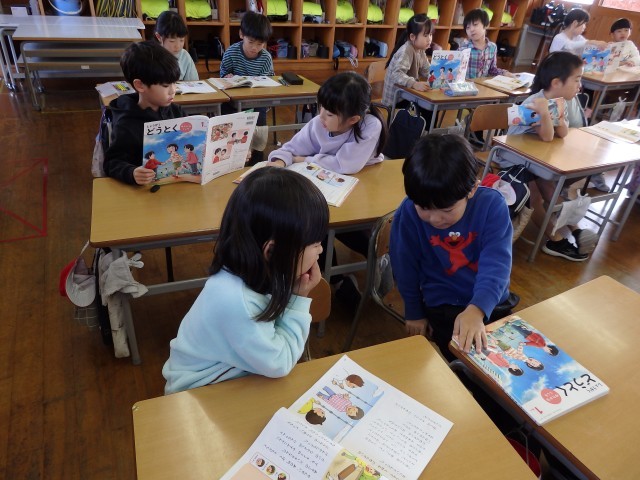 1年生の1時間目は道徳の授業でした。「アフターユー」という資料を読んで「優しい心」について考えました。資料は「ブランコの取り合いからケンカになってしまったぼくと友だち。そこへやって来た6年生が「アフターユー」と声を掛けてくれました。「アフターユー」は「お先にどうぞ」という意味なんだそうです・・・」という内容です。資料を読んでの感想や6年生が優しくしてくれたのはなぜかを隣の人と話し合いながら考えました。
