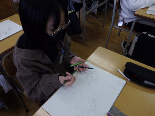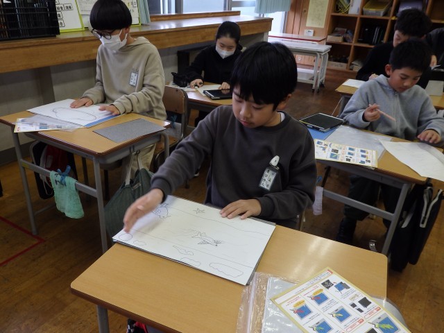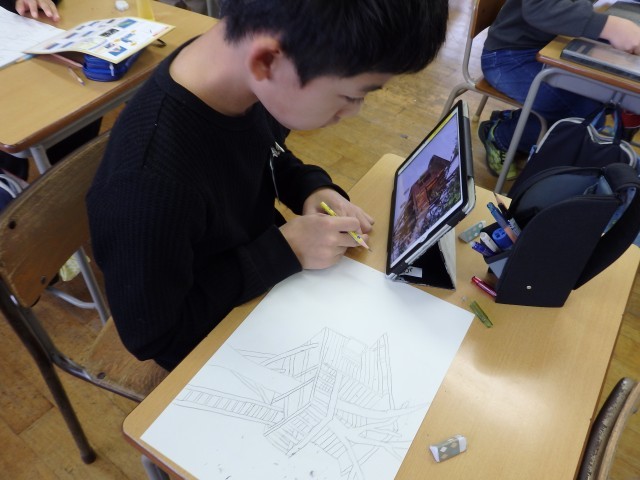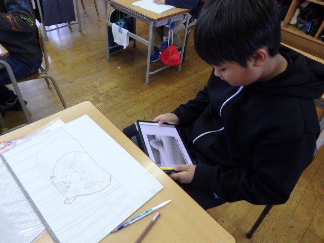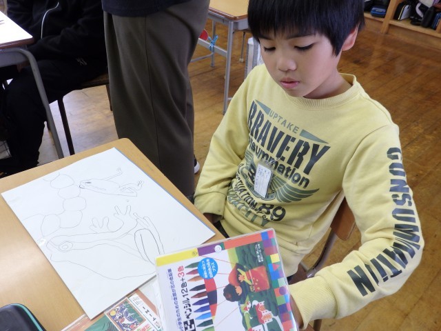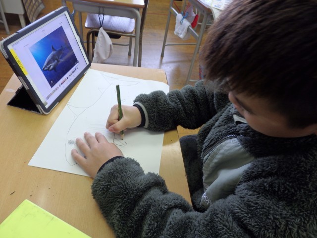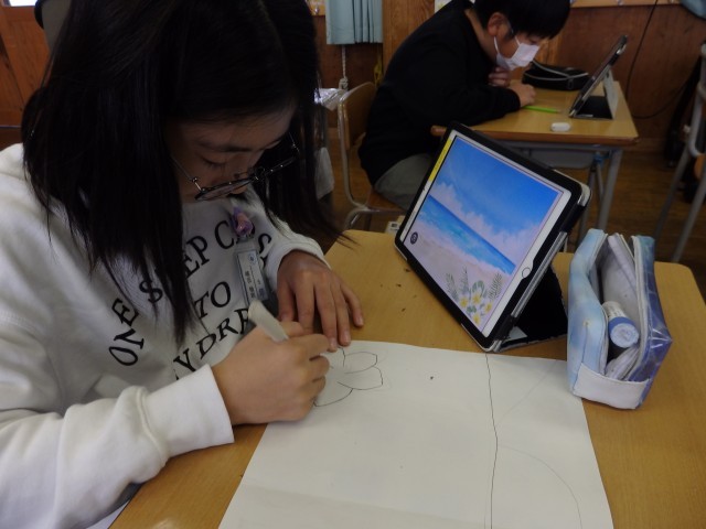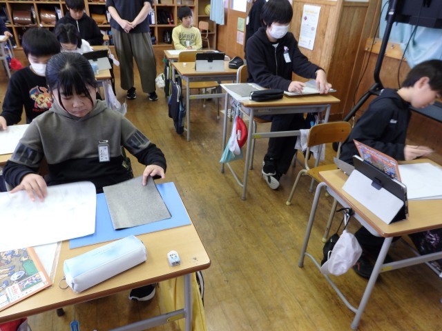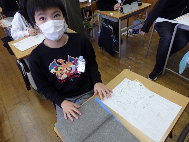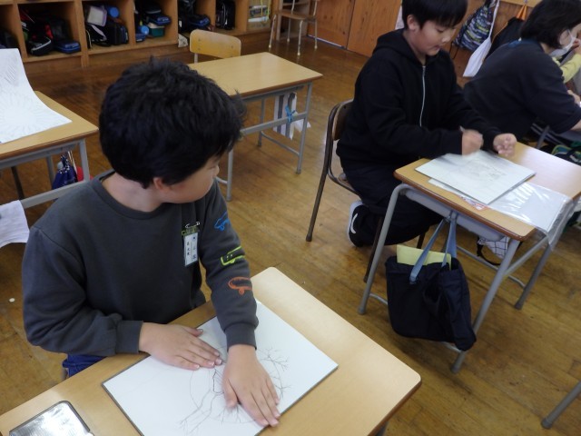 5年生の4時間目は図工の授業でした。木版画の下書きです。宇宙、海、ススキと月、カエル、カブトムシ、サメ、花、イカ、ツリーハウス、飼っているペットなどいろいろな物が描かれていました。みんな、とても上手です。下書きが終わった子から板に転写していきました。