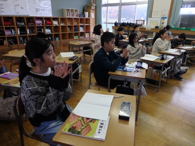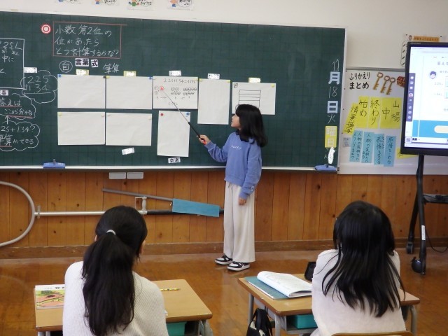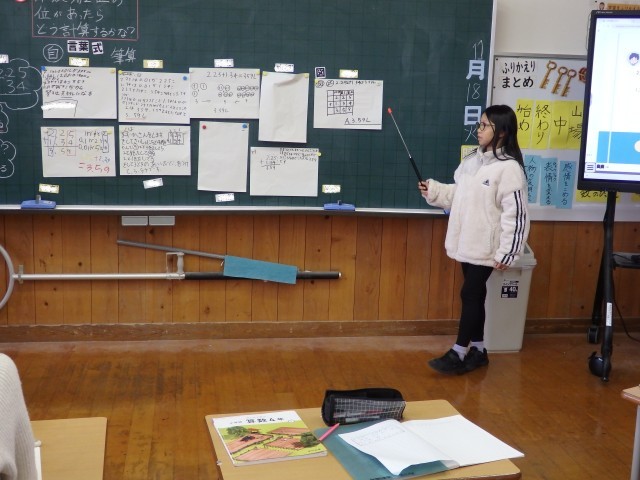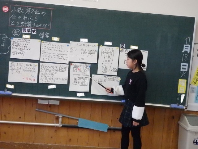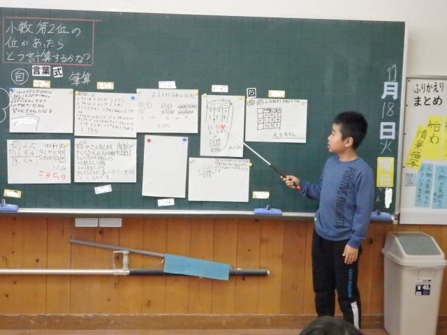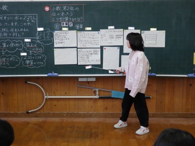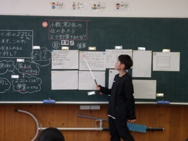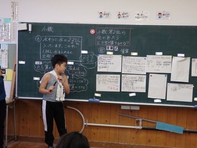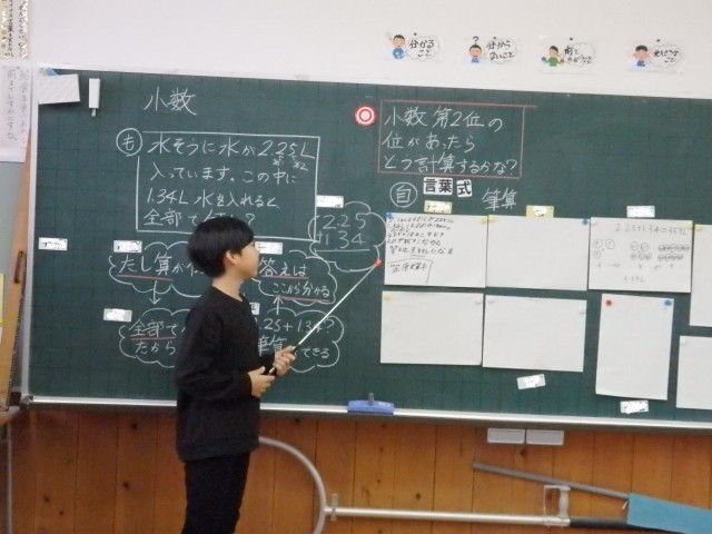 4年生の4時間目は算数の授業でした。小数の計算の学習です。「水槽に水が2.25L入っています。この中に1.34Lの水を入れると、全部で何L?」という問題に取り組み、小数第2位がある数の計算をどうしたらよいか考えました。ことばや式や図、さらには筆算で自分の考えを書きました。実に9人もの子たちが前に出て発表しました。「1円玉、0.1円玉、0.01円玉」で考えた子、表のようにして位をそろえた子、色分けして見やすく工夫した子、「2.25は0.01が225個・・・」と文章を書いた子、確かめ算まのやり方まで考えた子などたくさんの考えが発表されました。
