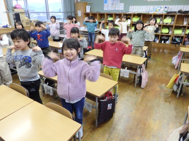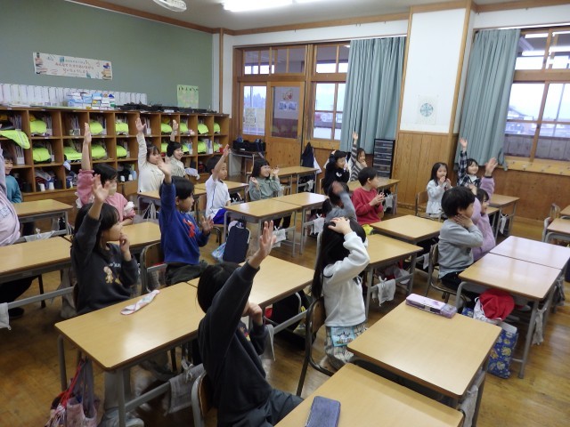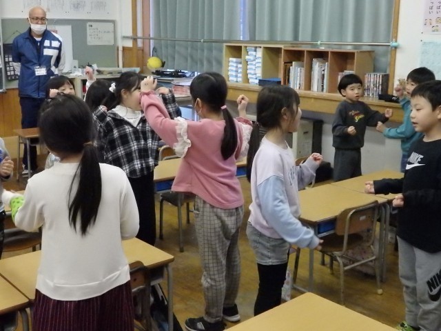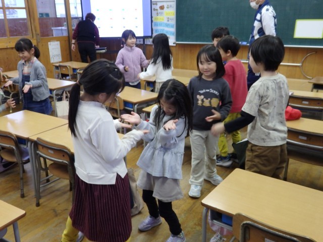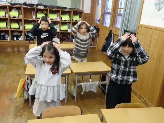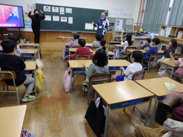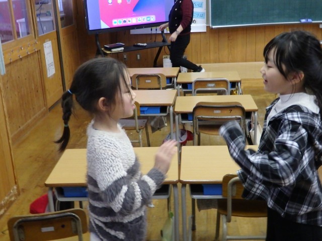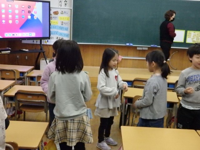 1年生の5時間目は国際科の授業でした。まずは「Hello, How are you?」という歌で振り付け踊って、ペアを変えながら歌いました。いろいろなことペアを組んで楽しそうに歌っていました。次に「Head, shoulders, nees and toes」の歌をそれぞれの体の場所を触りながら歌いました。最後に頭、口、鼻、耳などの体を表す英語を練習した後、「マッチングゲーム」を行いました。みんな笑顔で楽しく英語を学習していました。