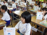 1年生の3,4時間目は生活の授業でした。秋に収穫したサツマイモのつると「秋を探して」の学習で採集した松ぼっくりや木の実などを使ってリースづくりです。最初に先生からグルーガンの使い方と注意することについてお話を聞いてから、1つずつリースに付ける物を選んでグルーガンでのり付けしていきました。1つ付け終わったら、2つめの物を選びます。楽しそうに活動していました。グルーが手について、納豆のやじみたいに延びている子がいました。