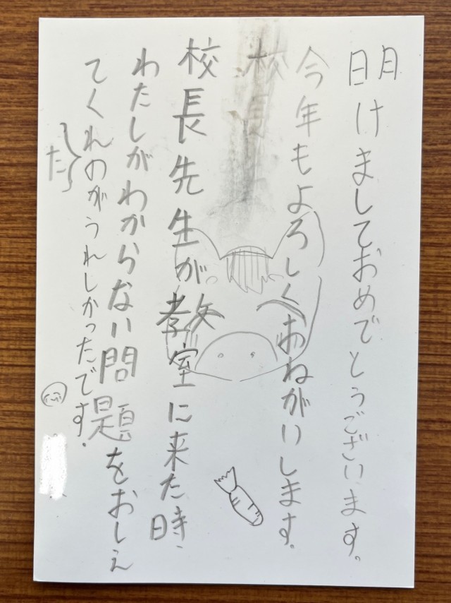 今日、4年生のある子から年賀状が私宛に届きました。子どもから年賀状をもらうなんて何年ぶりでしょうか。とてもうれしくなりました。ありがとう!