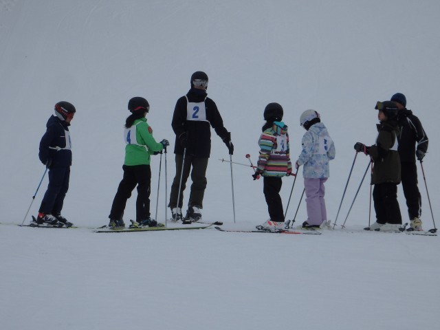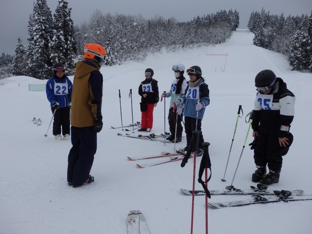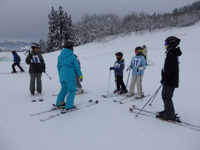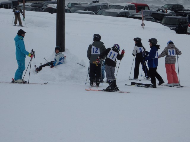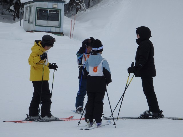 レッスン終了です。指導者の先生にあいさつをしてスキーを片付けます。最後の写真の2人は何をしているのでしょうか。