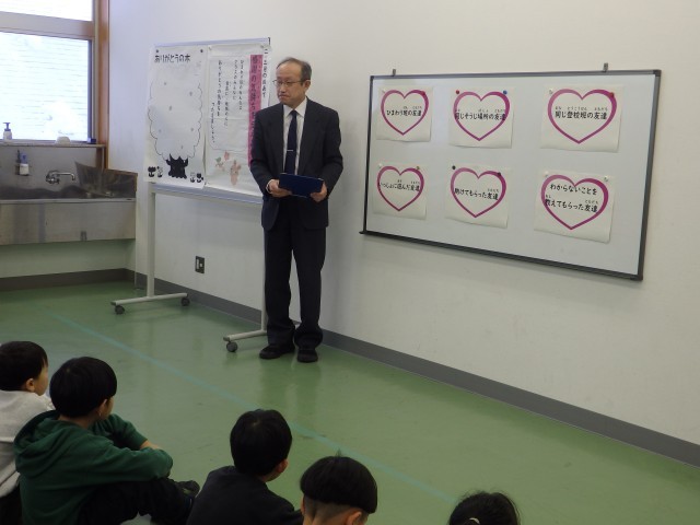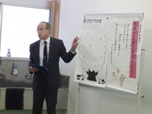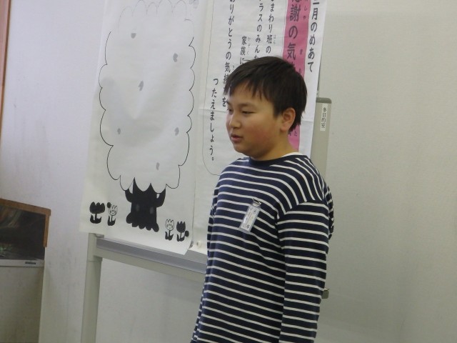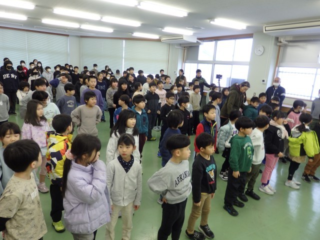 今朝の生活朝会は寒さ対策のため多目的ルームで行いました。今日の整列トップは5年生、2位は6年生でした。まずは1月の生活目標「気持ちを込めて元気にあいさつ」についての振り返りを2,4,6年生の代表の子が発表してくれました。「元気に挨拶ができてよかった」「登下校のときに地域の人にもあいさつできた」などの振り返りと共に「これからも気持ちを込めたあいさつを続けていきたい」という決意も発表してくれました。体調不良でお休みの子もオンラインで朝会に参加していました。