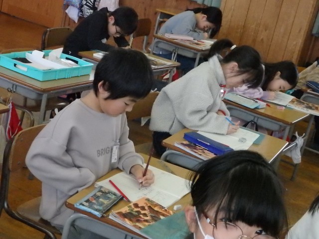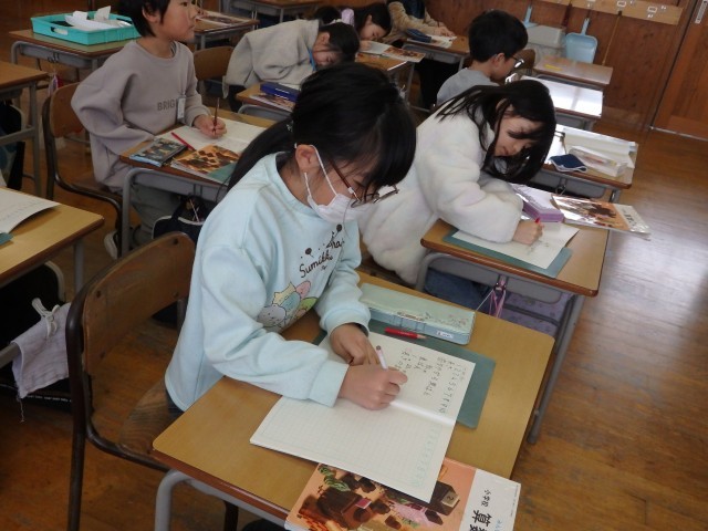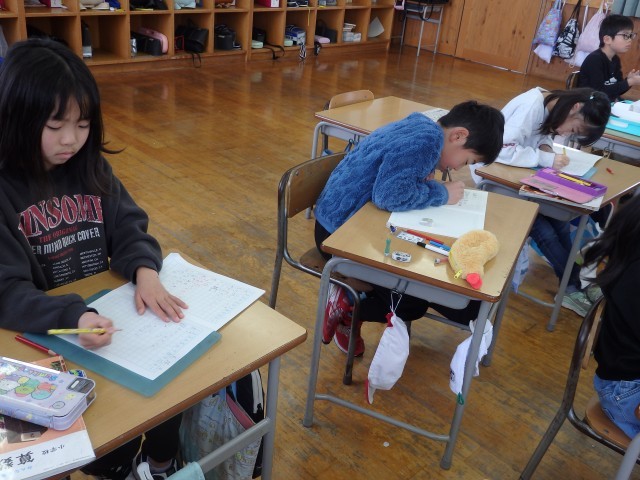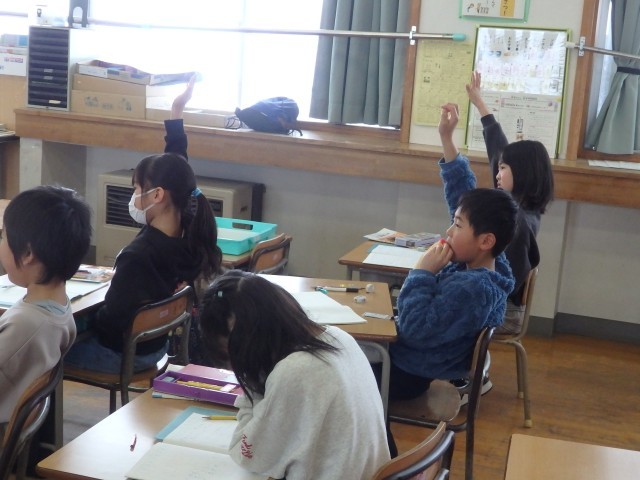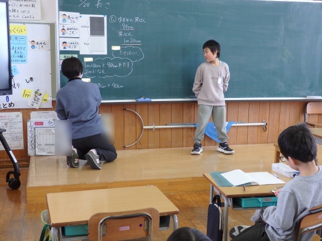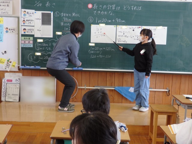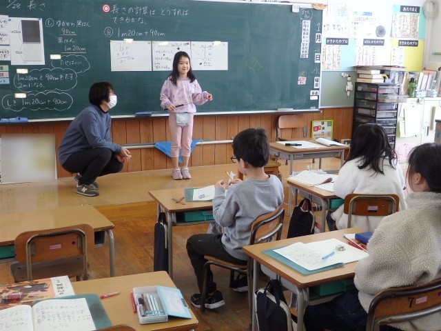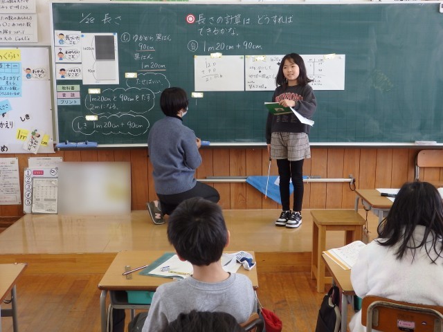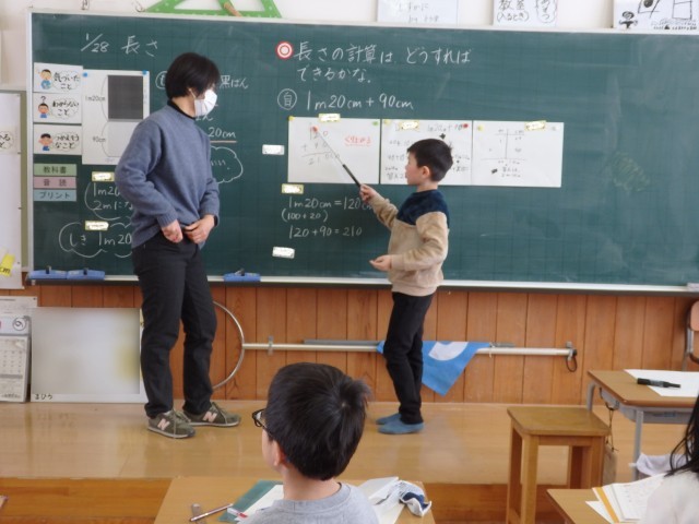 2年生の2時間目は算数の授業でした。「長さ」の学習です。「床から黒板の下までが90cm、黒板の縦の長さが1m20cmです。床から黒板の上までの長さは何cmですか」という問題に取り組んでいました。すぐに子どもたちから「足し算すればいい」という意見が出され、さらに「もう考えをノートに書いていいですか」という声も出ていました。1m20cmを120cmに直して筆算したり、位取り表を使って計算したり、さくらんぼ算のようにして計算していました。