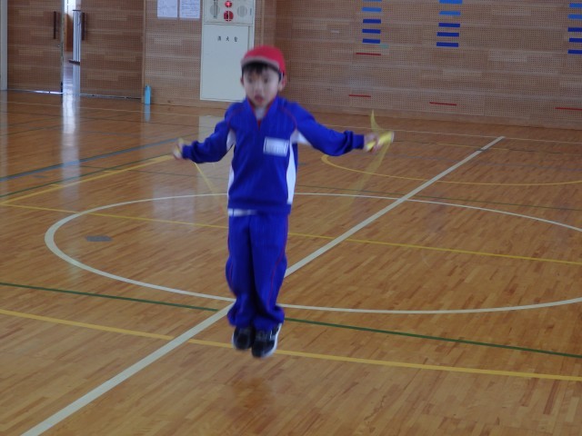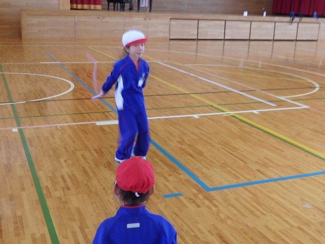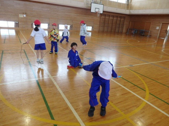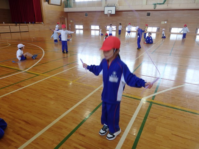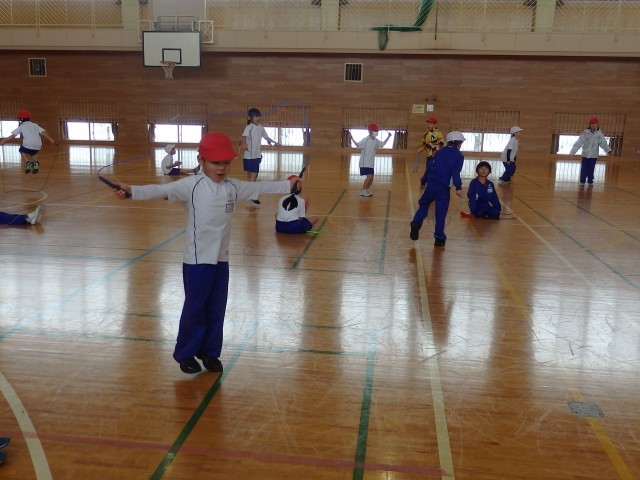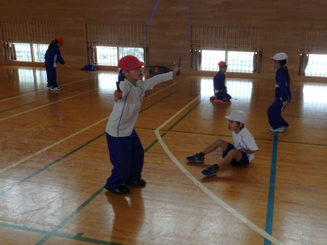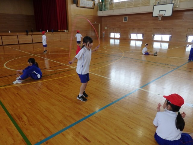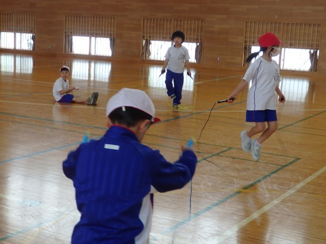 1年生の体育の続きです。ウォーミングアップが終わったら、今日から縄跳びの学習です。初めての縄跳びですので、縄の長さを確認したり、片手で持ってまっすぐ前に回す練習から行いました。しばらく1人1人で跳ぶ練習をした後、2人ペアになって「1分間に合計何回跳べるか」を挑戦しました。初めての子はなかなか難しかったようですが、慣れている子は70回、90回と跳んでいる子がいました。