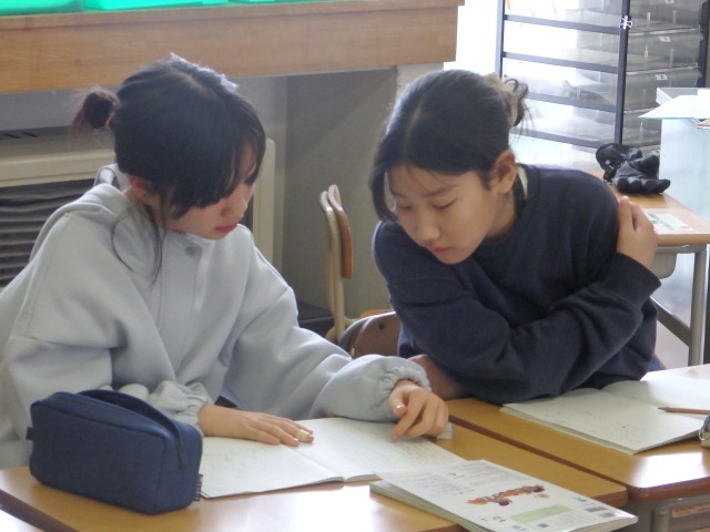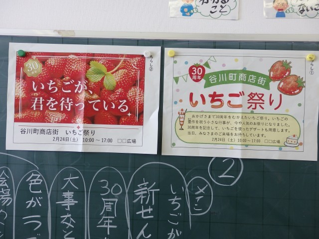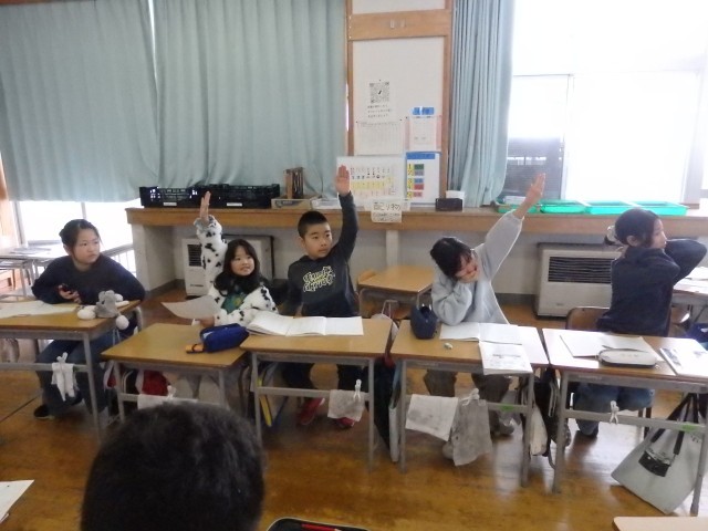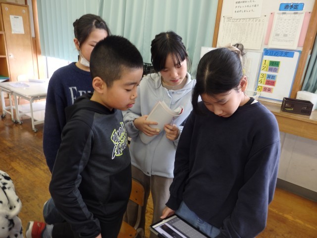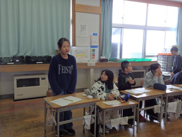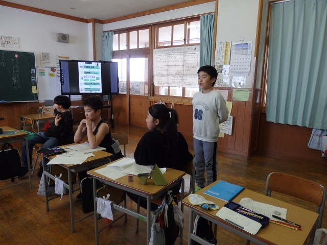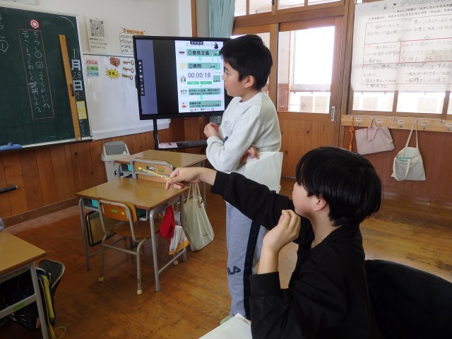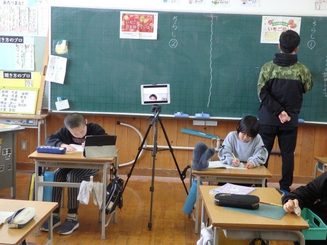 4年生の4時間目は国語の授業でした。ある町のイベント「いちご祭り」の2つのチラシについて、どちらがいいかをディベートで話し合っていました。勝敗を判断するのはオンラインの子も含めた3人の審判員です。「なぜこのチラシがいいのか」をアピールしたり、相手の意見に質問を出したり反論したりします。チームで相談しながら討論を楽しんでいました。