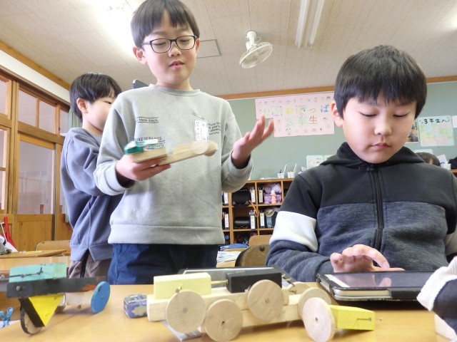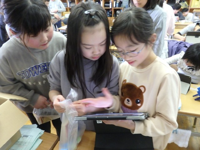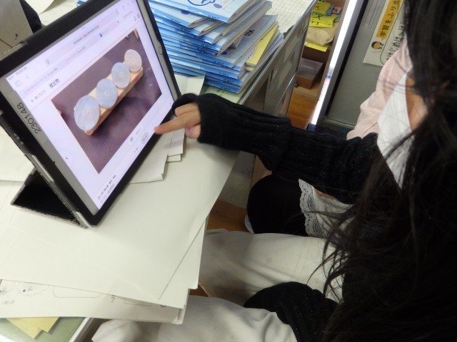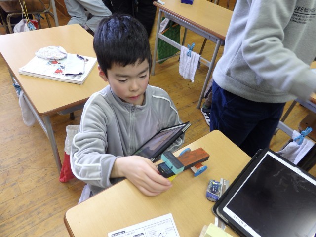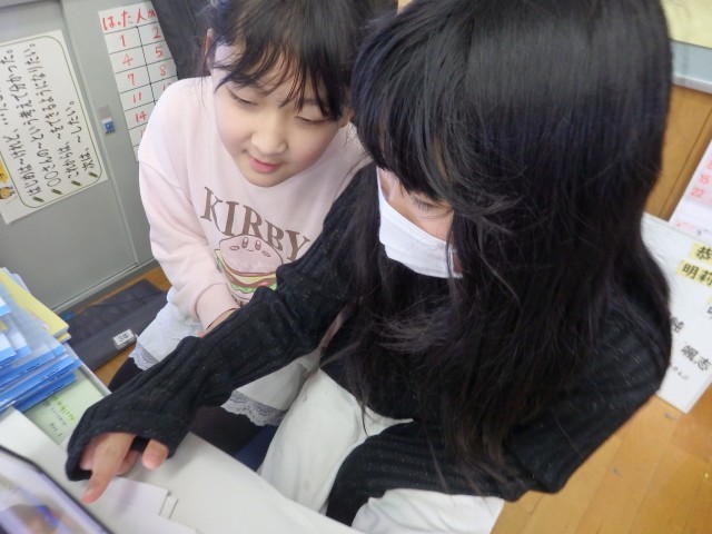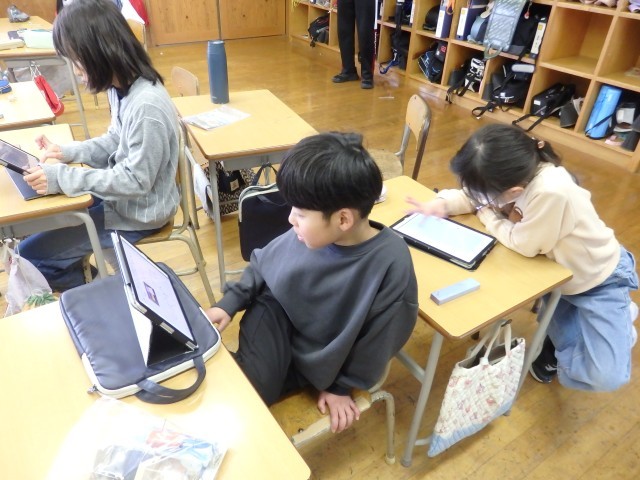 2年生の5時間目は図工の授業でした。「トントンどんどんクギ打って」で作った作品を写真に撮って、iPadのオクリンクプラスというアプリで提出しました。1人1人の作品をiPadの画面上で鑑賞できるようになります。iPadの操作を教え合ったり、一緒にみんなの作品を鑑賞したりしていました。