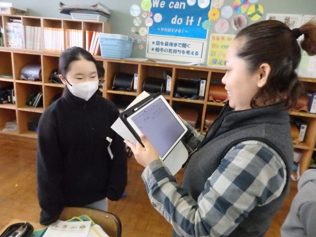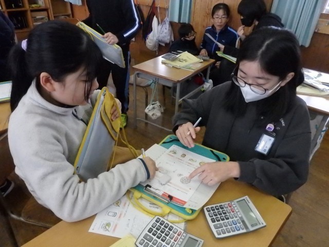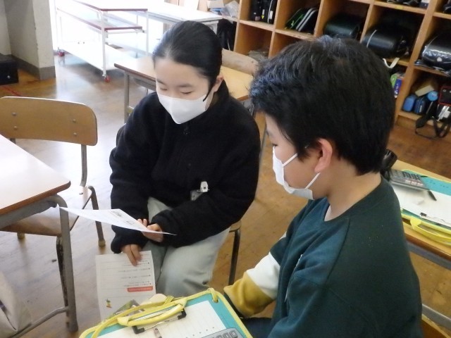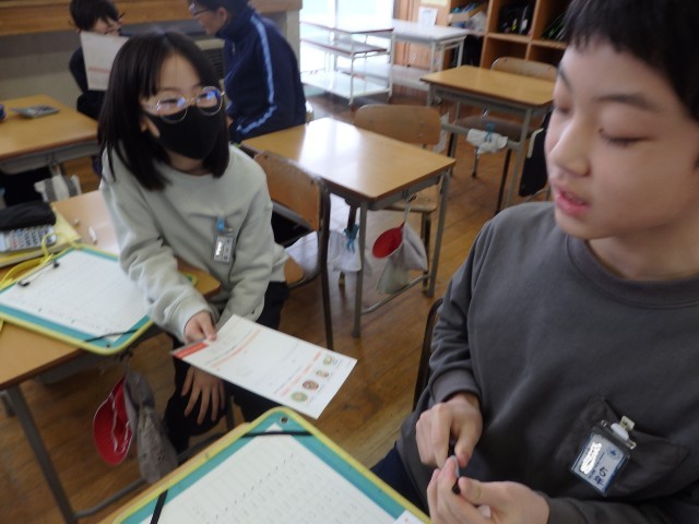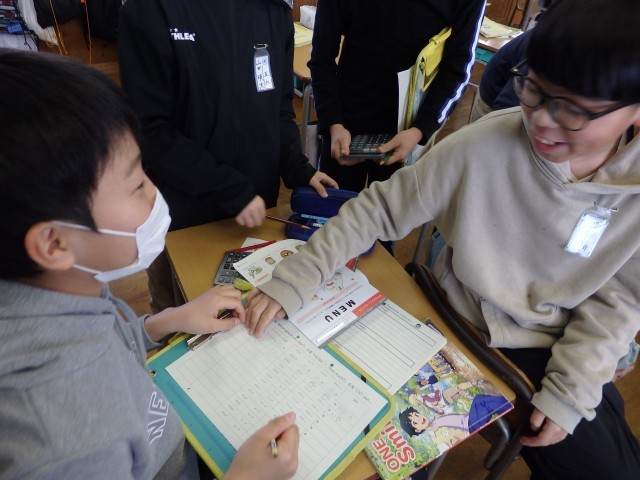 5年生の1時間目は国際科の授業でした。前の時間に作ったオリジナルのメニュー表を使って、1人1人がレストランのオーナーになります。ペアを作って店員とお客になり、注文をとったり、値段を伝えるやり取りをしました。いろいろな人とペアになって楽しそうにやり取りをしていました。良心的な値段のお店もあれば、「高すぎっ!」とビックリするようなお店もありました。売り上げNo.1は誰でしょうか。
