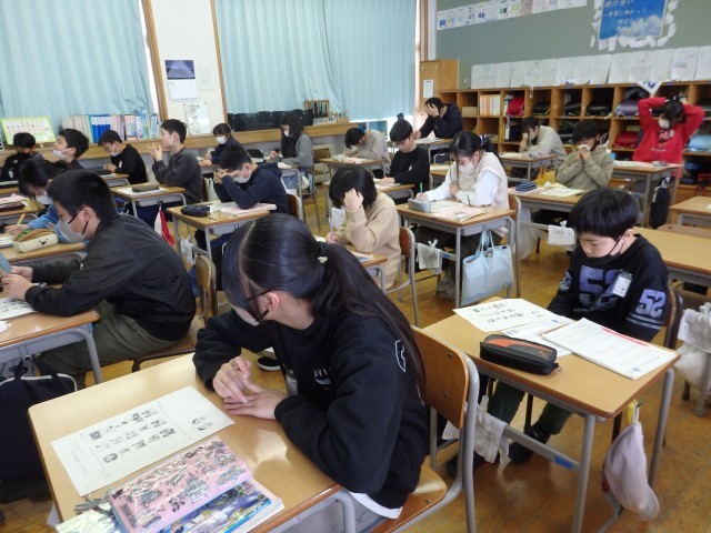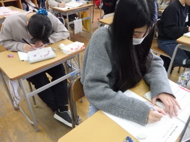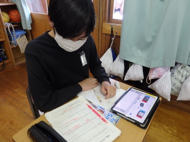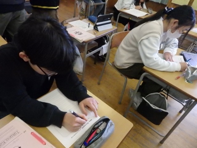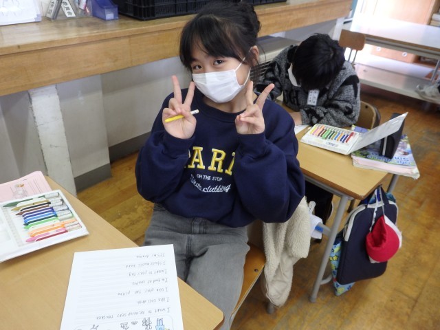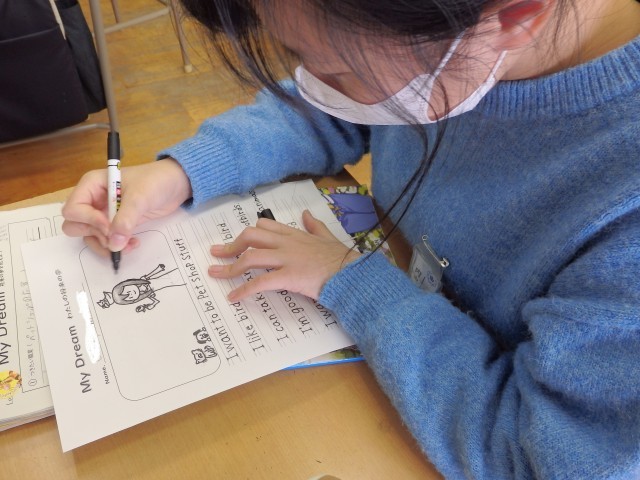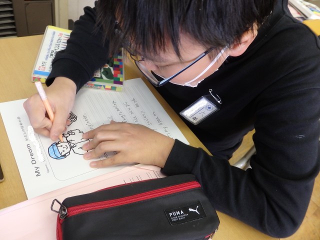 6年生の2時間目は国際科の授業でした。まずは前回の続きで、「将来の夢」についての作文を清書しました。丁寧に英文を書いて、絵も色を塗っていました。お子さんがどんなことを書いたのか卒業式当日、控え室にてご覧ください。後半は単元のまとめのテストと振り返りをしました。