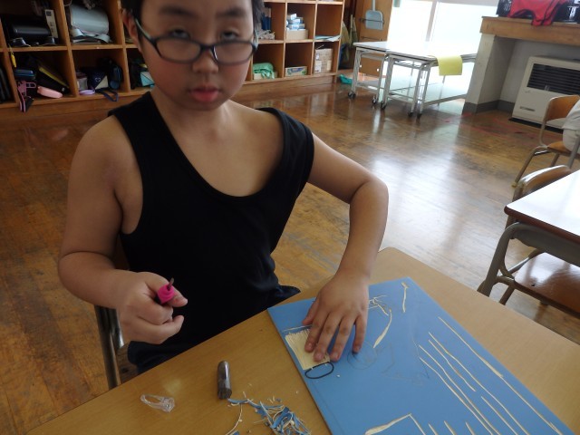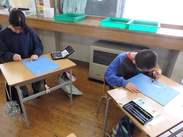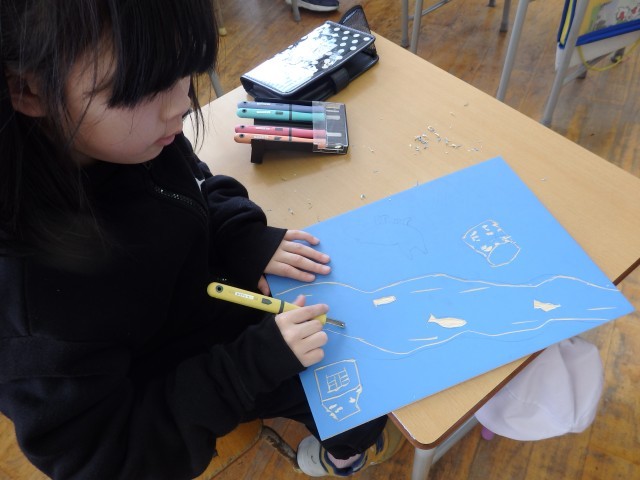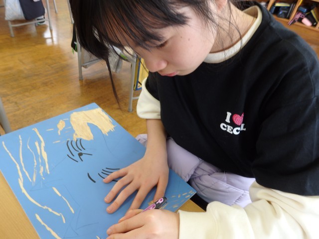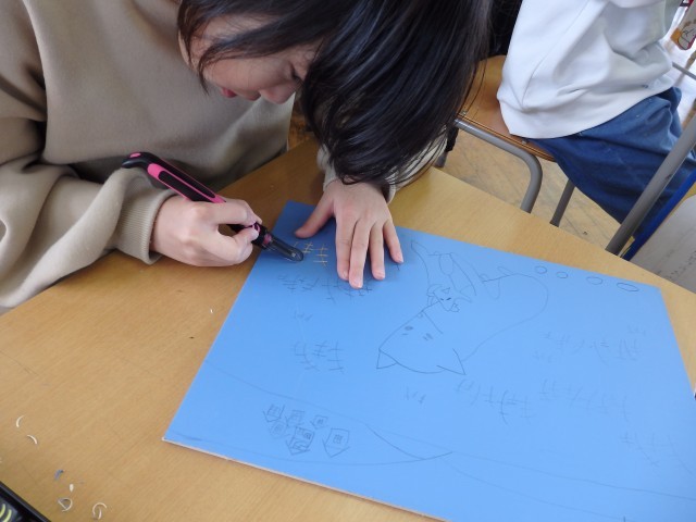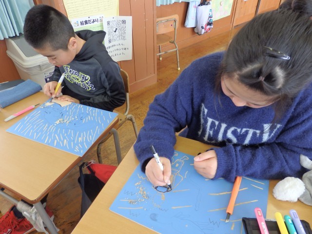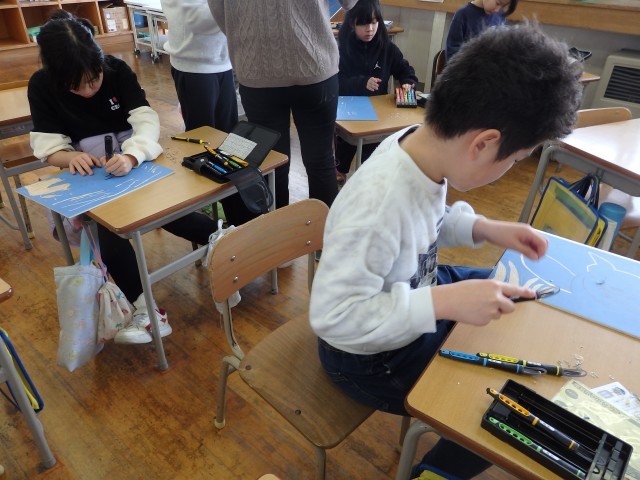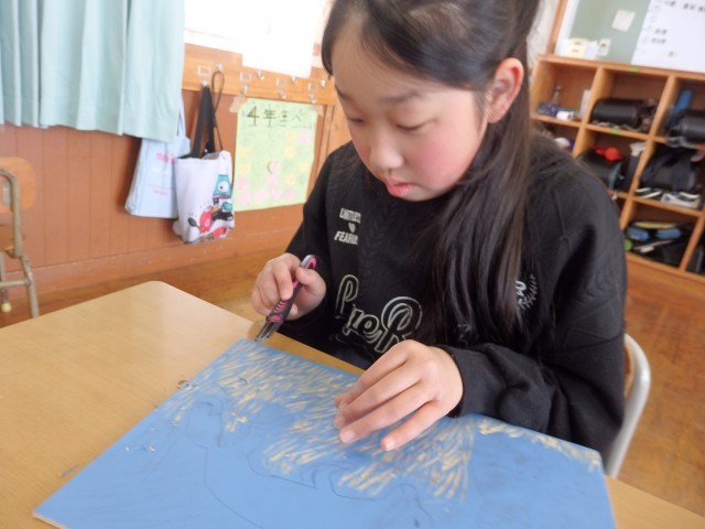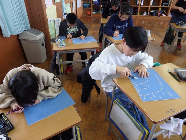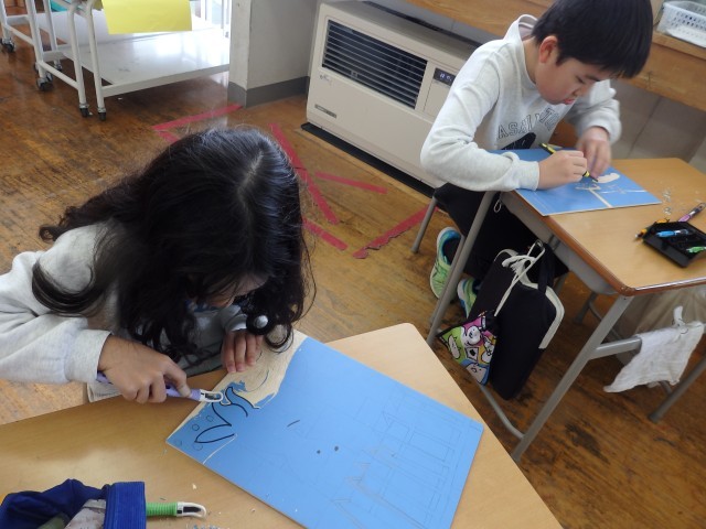 4年生の5時間目は図工の授業でした。版画の学習です。国語で学習した「ごんぎつね」の心に残った一場面を描きます。下書きも終わり、みんなが彫る活動に入っていました。黙々と刃先に集中していました。