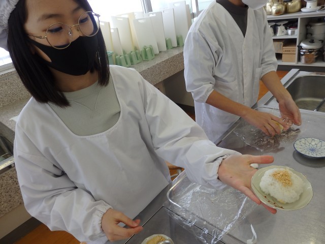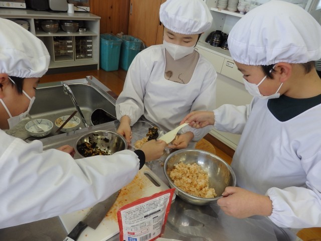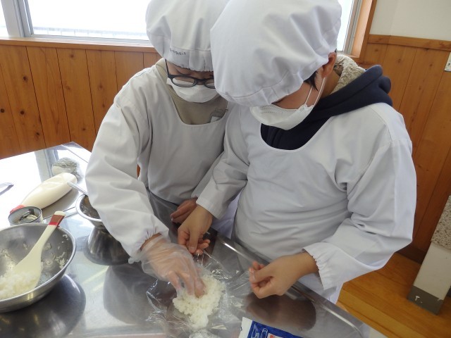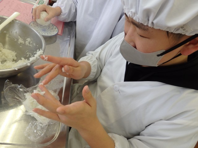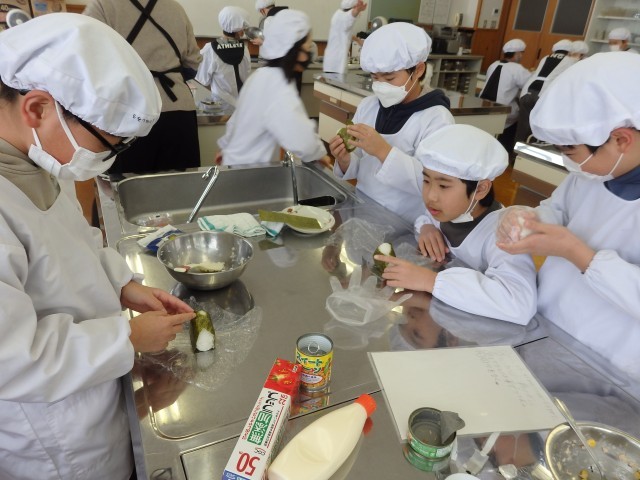 5年生のオリジナルおにぎり作り。下ごしらえが終わりご飯も炊けたので、おにぎりを握っていきます。少し小さめにして何個も握っている子もいれば、ソフトボール並みに巨大なおにぎりにしている子もいました。班で協力して、和気あいあいとした中で握っていました。