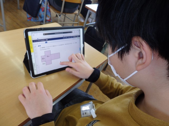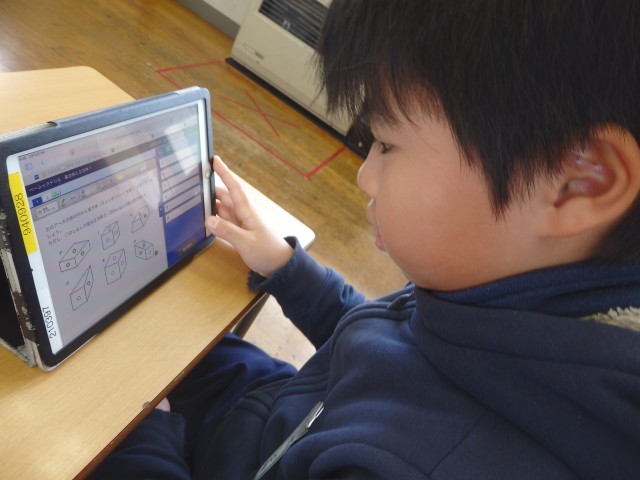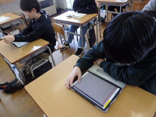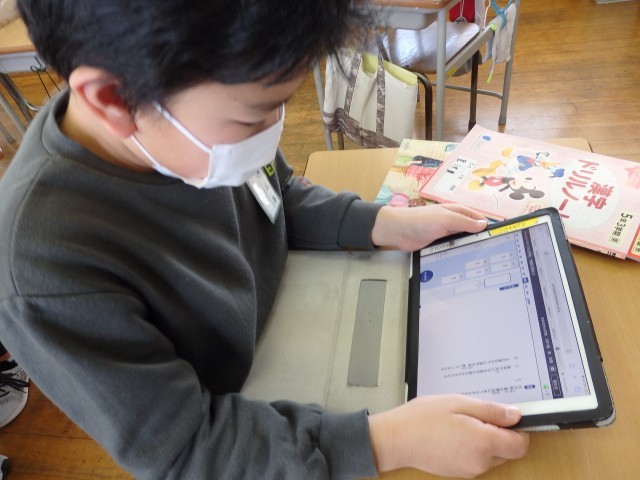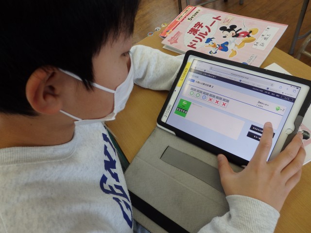 5年生の1時間目です。図書室で本を借りてきた子からiPadの「ドリルパーク」で学習していました。今日は2,3時間目にCRT学力検査を行いますので、その最終確認ですね。