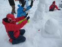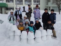 雪像作りもまずは大きな雪の玉を作ります。大きくなってくると重くなって低学年の子達では転がせません。上の学年のお兄さんお姉さんが助けてあげて一緒に転がします。