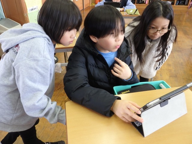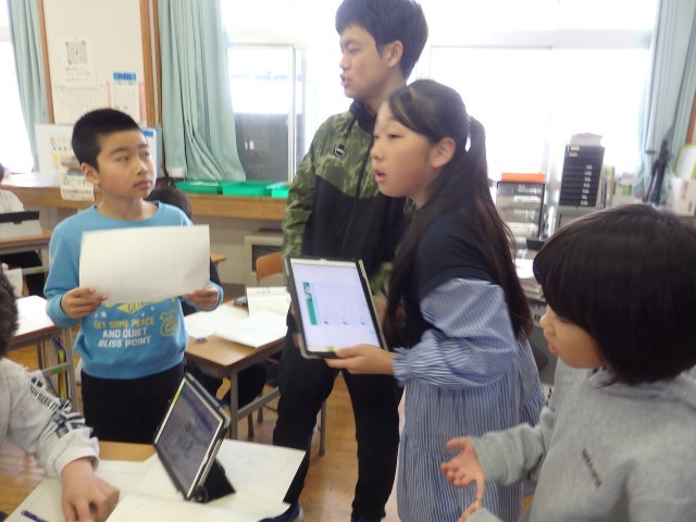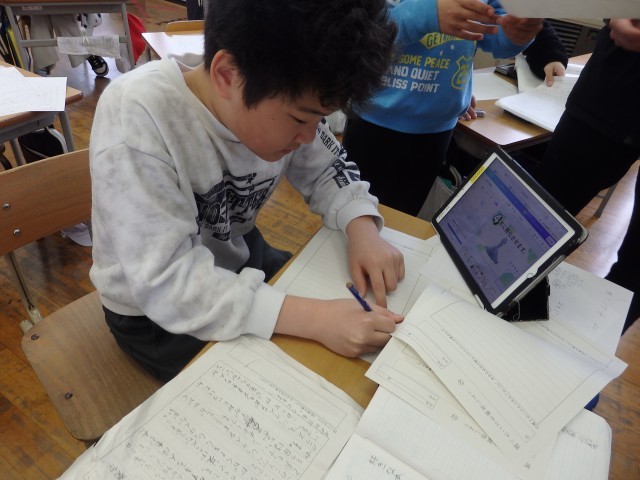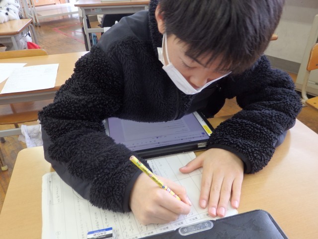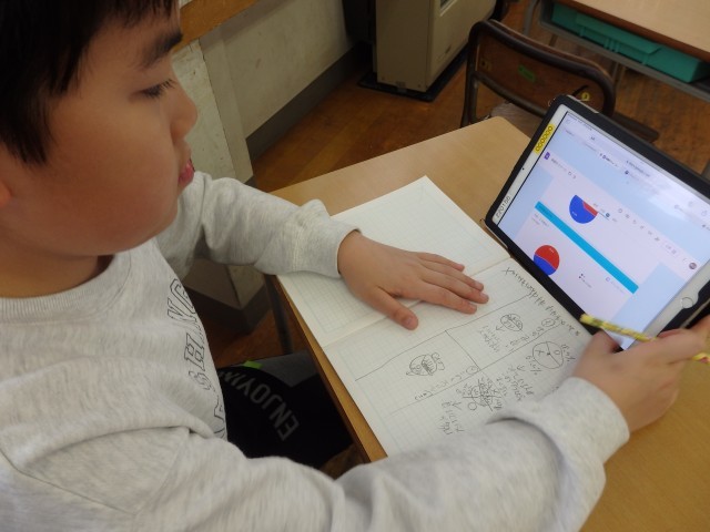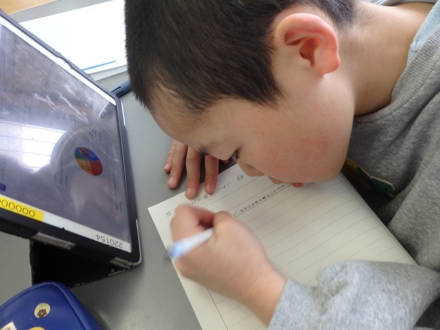 4年生の1時間目は国語の授業でした。「調べたことを報告しよう」の学習です。クラスのみんなに「好きな曜日」「好きなスポーツ」「ALについてどう思うか」など、自分でテーマを決めてアンケートをとりました。その集計結果から分かることや、結果を基にしてクラスのためになることやできることを考え、まとめていました。「好きなスポーツ」について調べた子は、「球技が好きな人が多い」ことから「お楽しみ会で球技をしたらいいんじゃないか」と考えていました。