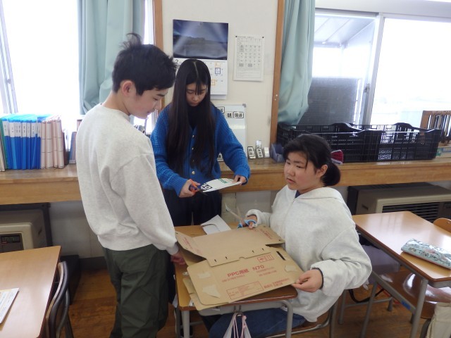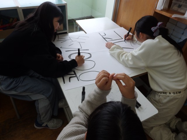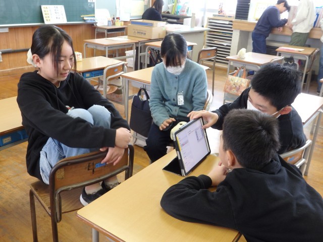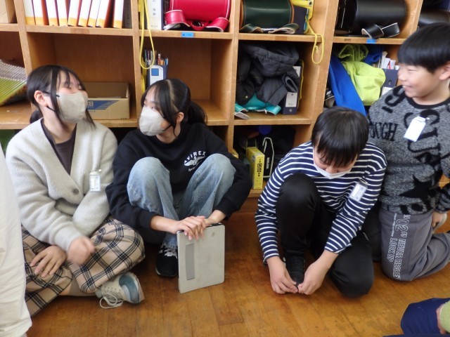 6年生の1時間目は学活の授業でした。「6年生を送る会」での出し物の準備をしていました。6年間の思い出を劇にして発表するようです。各行事ごとのチームに分かれて、シナリオを考えたり、小道具を作ったりしていました。学習発表会でエンタメ力を発揮した6年生です。「6送会」本番を楽しみにしています。