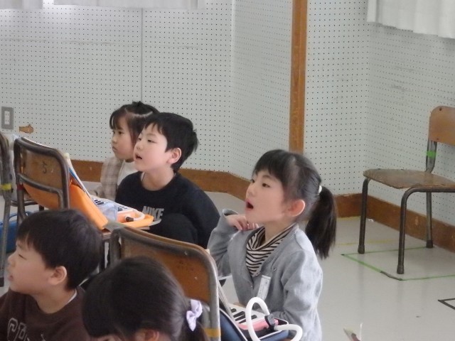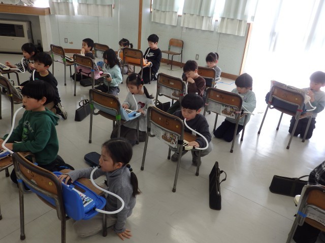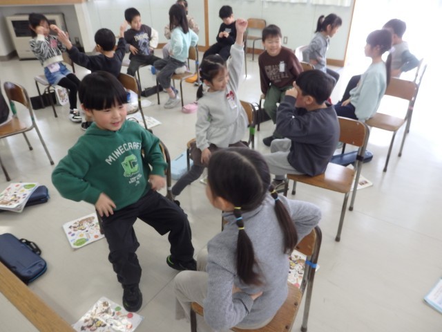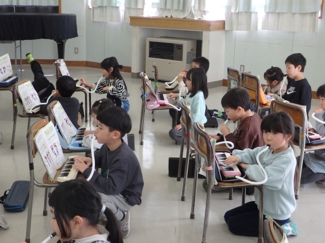 1年生の4時間目は音楽の授業でした。「おちゃらか、ほい」からのスタートです。前回は「おちゃらか、おちゃらか」のところで、手が左右逆になってしまって上手くいかなかったのですが、今日は息ピッタリでうまくできました。笑顔で楽しそうですね。その後、「とんくるりん ぱんくるりん」という歌を歌ったり、鍵盤ハーモニカで演奏したりしました。