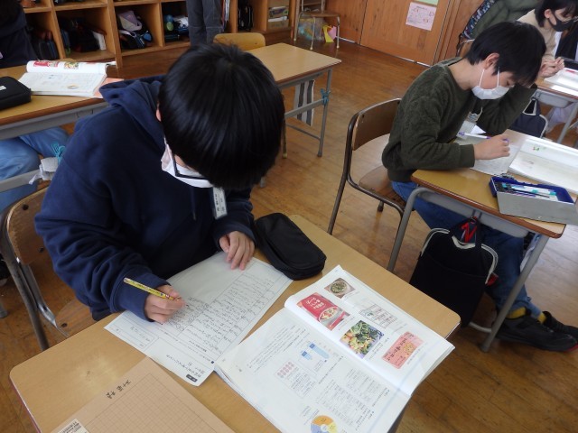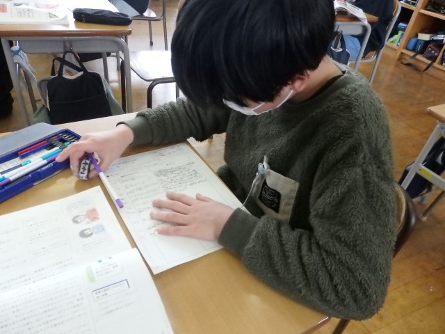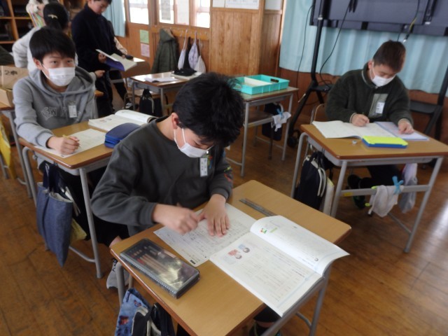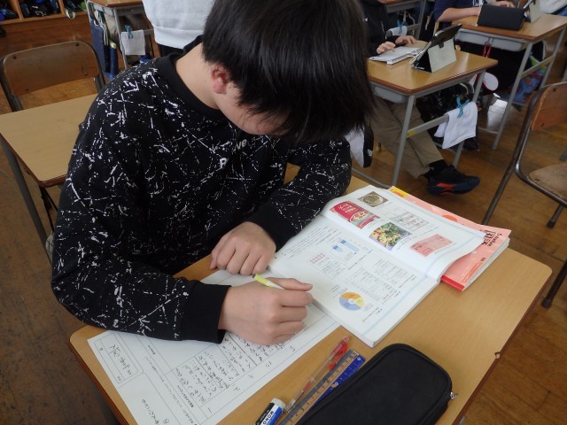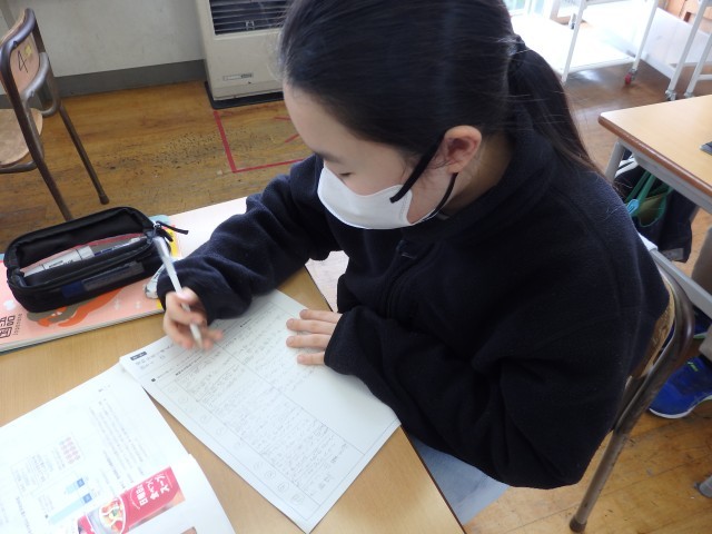 5年生の4時間目は国語の授業でした。教科書に載っている食品ロスに関してグラフや表、写真など10個の資料を見て、分かったことを表に書いていました。さらに、分かったことをもとにして、自分が考えたことも書いていきました。南魚沼市の小中学校で取り組んでいる「読む力の育成」では、文章だけでなく図表やグラフ内容を読み取ることを「正しく読む」、正しく読んで分かったことをもとにして、その原因や理由を考えたり自分の考えをつくったりすることを「深く読む」としています。今日の授業は「正しく読む」と「深く読む」両方の活動を行ったことになります。終わった子からキーボードを使ってローマ字入力のタイピング練習をしていました。