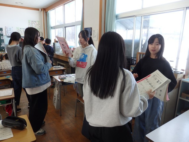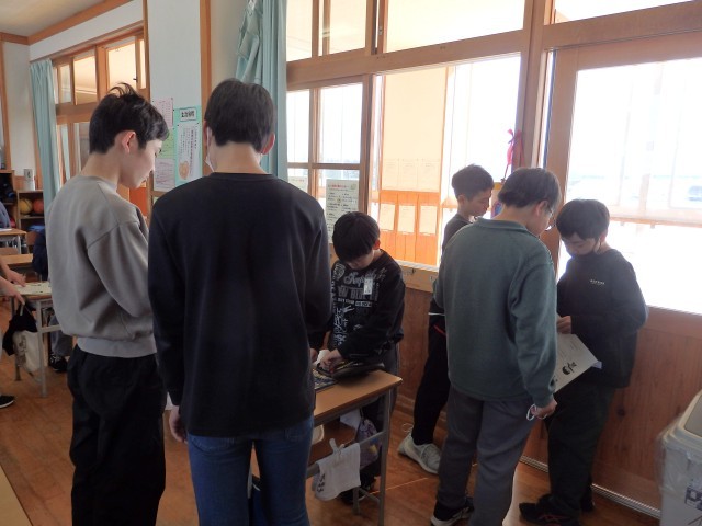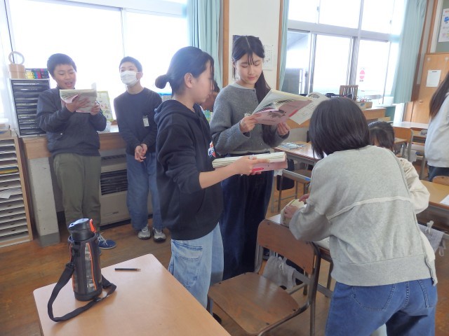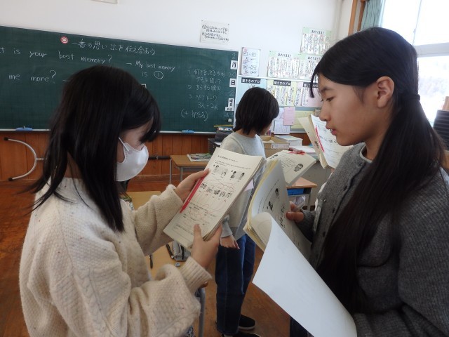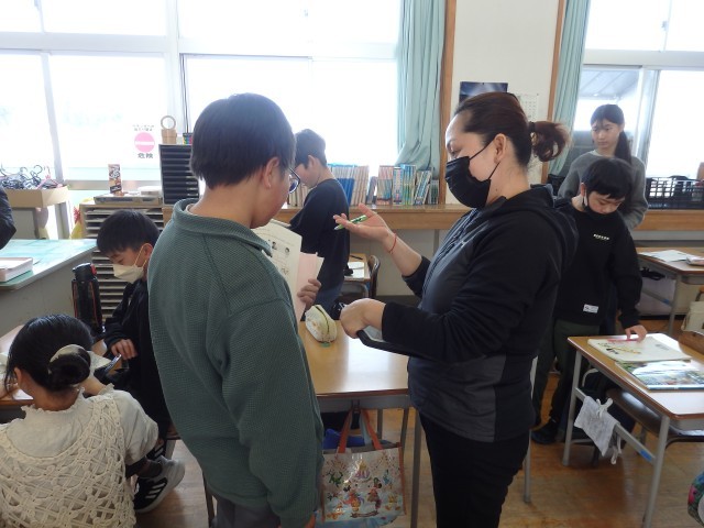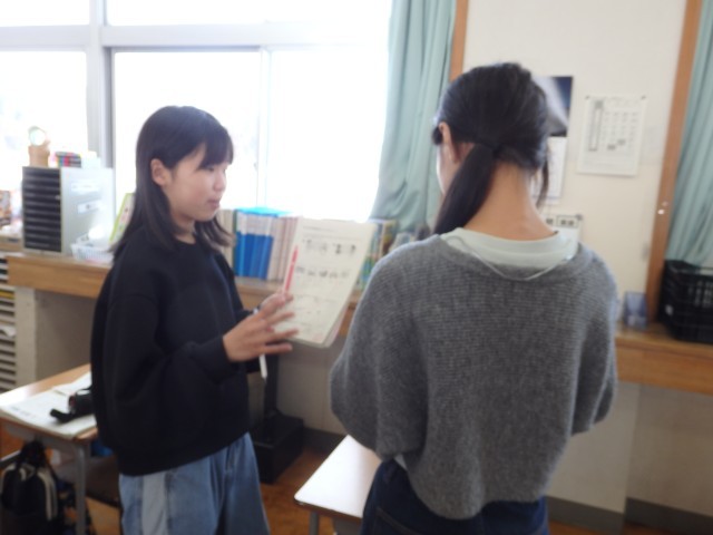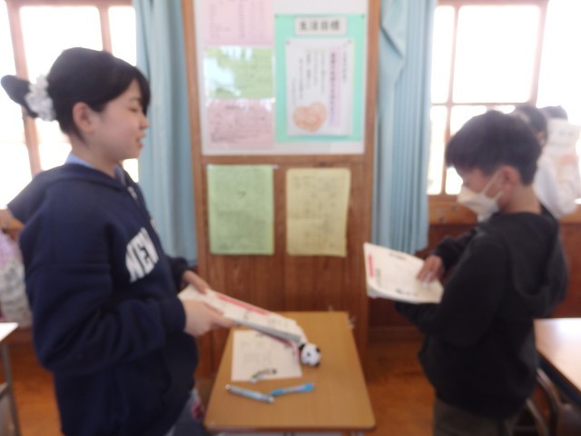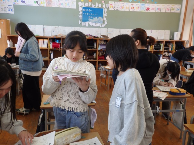 6年生の5時間目は国際科の授業でした。「小学校での一番の思い出」について、「どんなことをしたのか」などのエピソードや感想などを含めて、ペアでやり取りをして伝え合いました。対話が終わったら、やり取りをした人からサインをもらいます。3人の人とやり取りをしたら、2人の先生とやり取りをします。目線を合わせたり、ジェスチャーをしたりしながら話している子がいました。