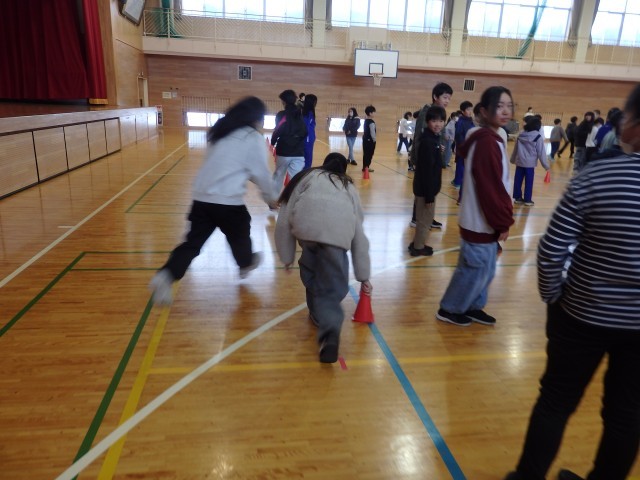 朝会終了時のおなじみの姿です。6年生が整列の目印に置いてある三角コーンを片付けてくれました。いつもありがとう!