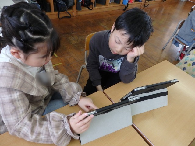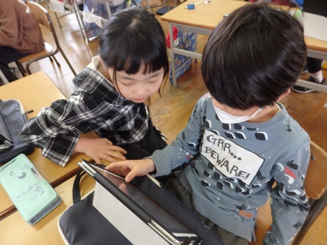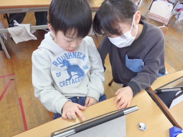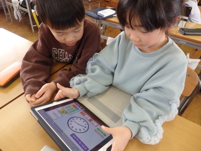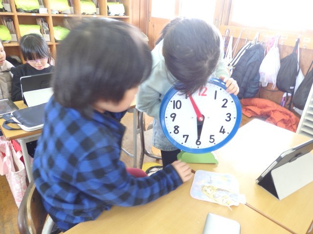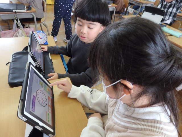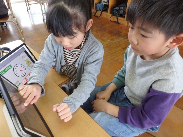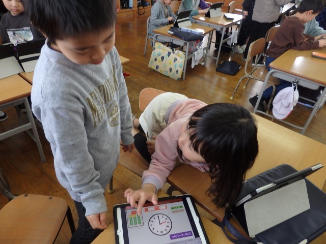 1年生の1時間目は算数の授業でした。時計の読み方の学習です。iPadのアプリを使って、ペアで問題を出し合いました。片方の人が時計の針をぐるぐる回して時刻を設定します。もう片方の人は時計の針を読んで何時何分かを入力します。正解するたびに満面の笑顔を浮かべて喜ぶ子どもたちでした。