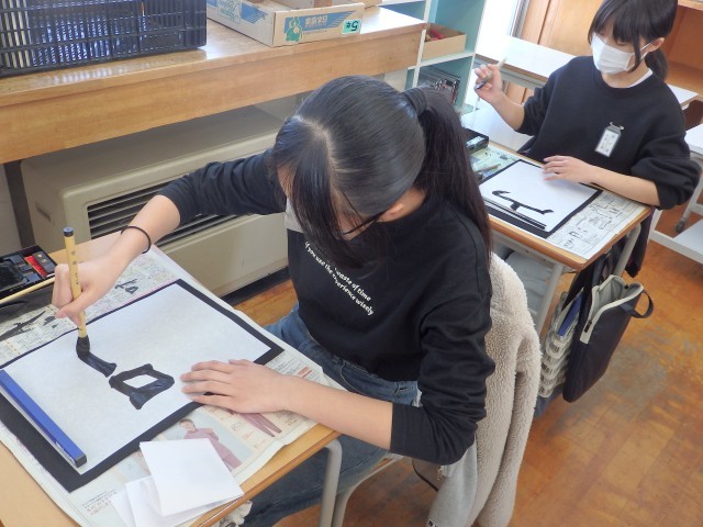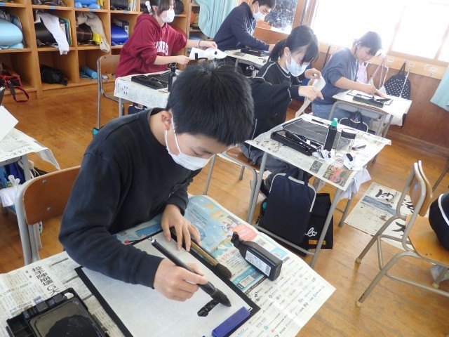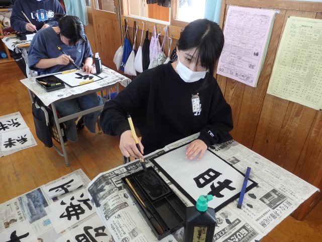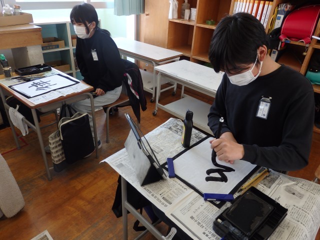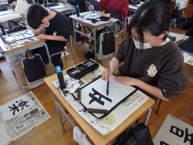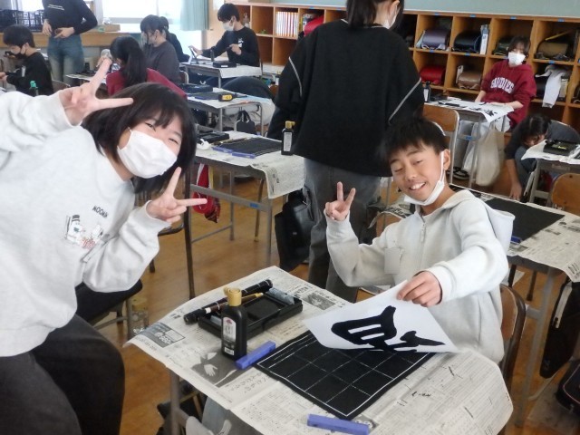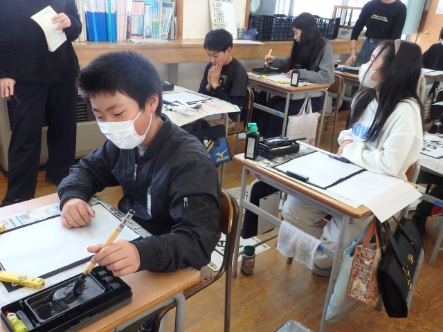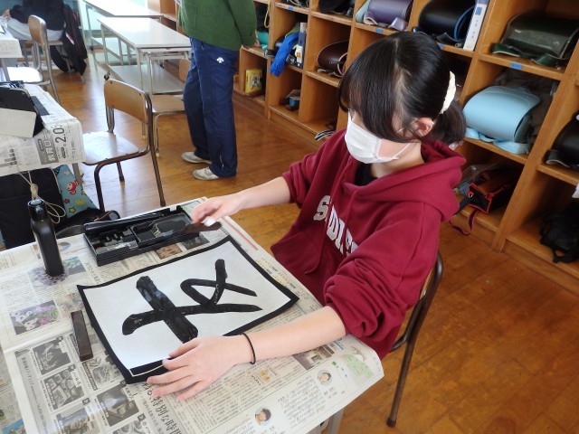 6年生の4時間目は書写の授業でした。今の自分を漢字一文字で表していました。1つの漢字を何度も何度も書いている子もいれば、1枚ずつ違う漢字を何枚も書いている子もいました。「夢」「追」「友」「絆」「叶」「律」などの漢字が書かれていました。