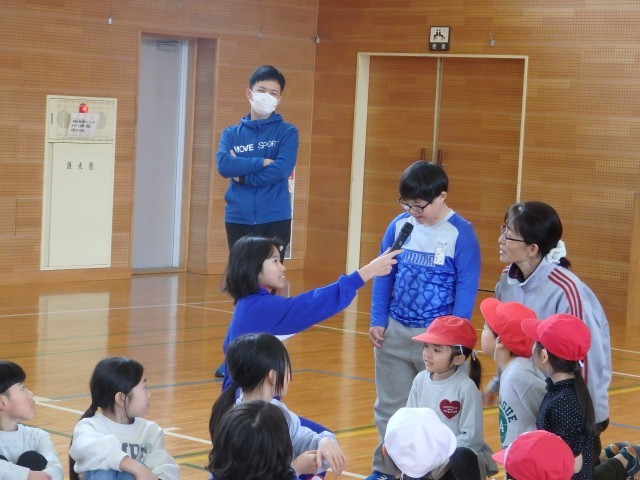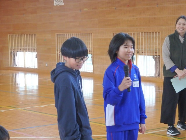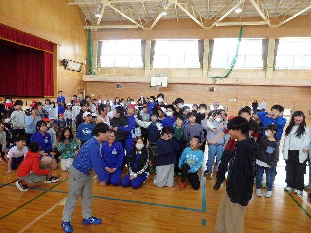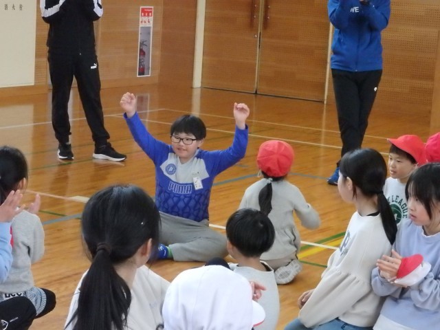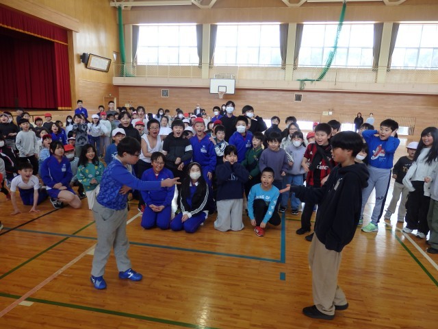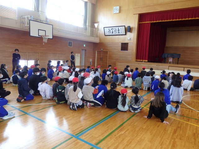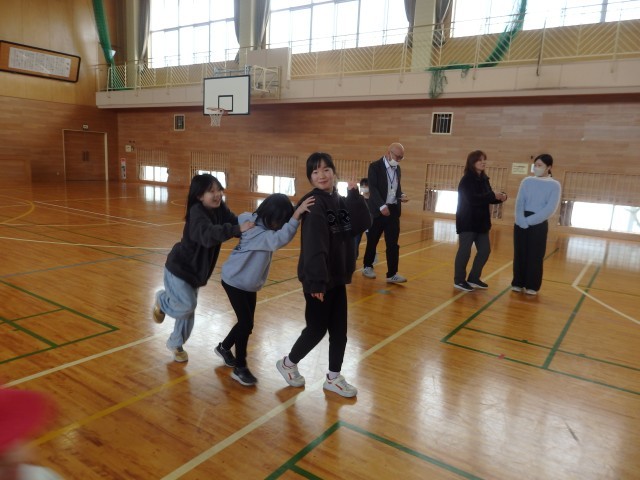 昼休みの全校ひまわり班でのジャンケン列車。長い列車が2つになったところで、先頭の2人でジャンケンです。全校のみんなで「最初はグー、ジャンケンポン!」の掛け声でジャンケン。1発でジャンケン列車王の決定です。自分の列車が勝って大喜びをしている人たちが見えるでしょうか。