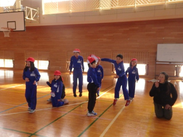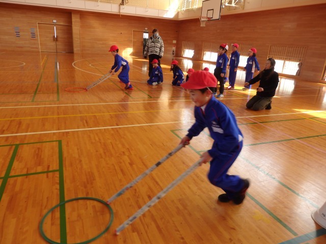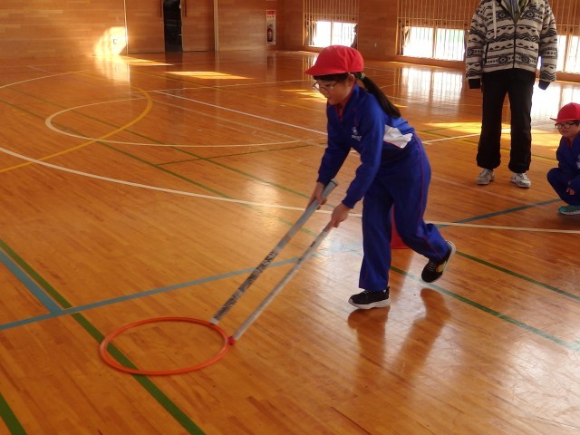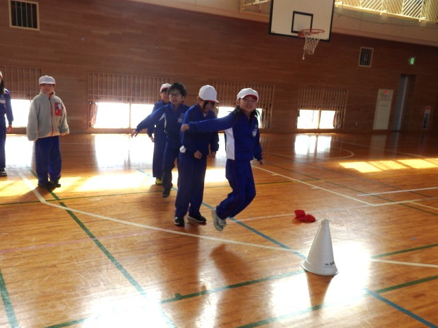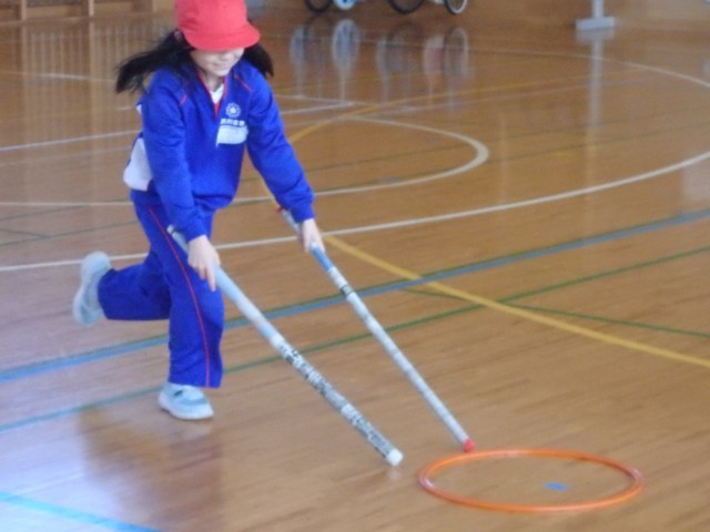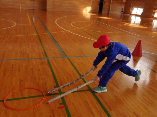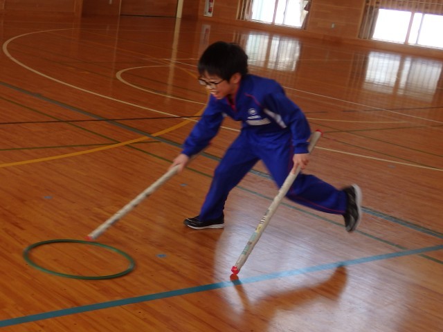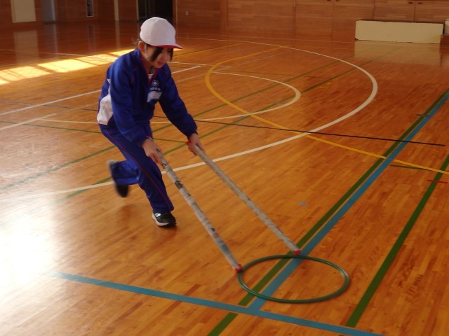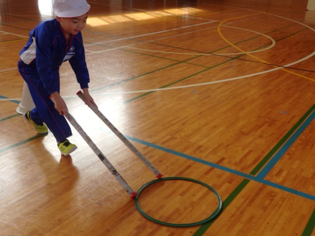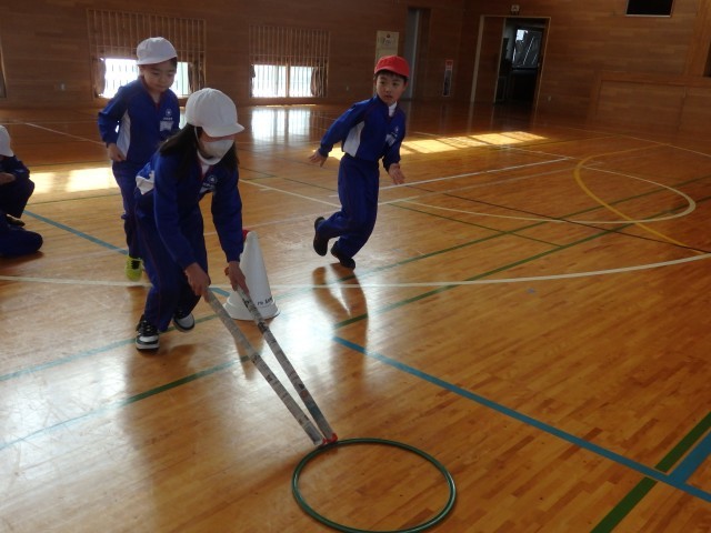 2年生の2時間目は体育の授業でした。「リング運びリレー」をしていました。リングを新聞紙の筒で押して運びます。2回戦して、1回戦目は筒が1本、2回戦目は筒2本で行いました。順番を持っている子たちが一生懸命に応援している姿がとてもよかったです。