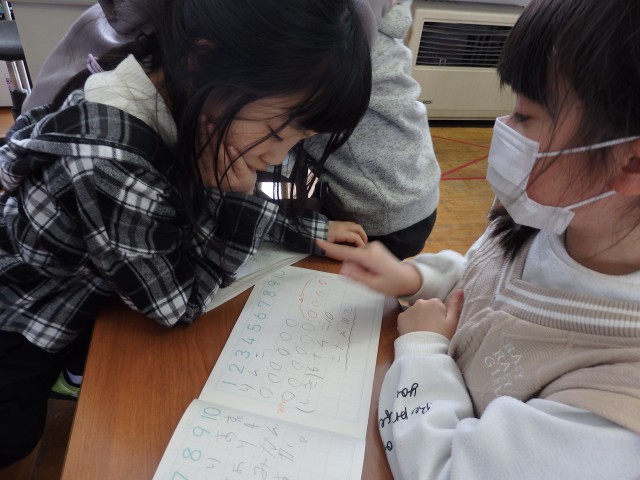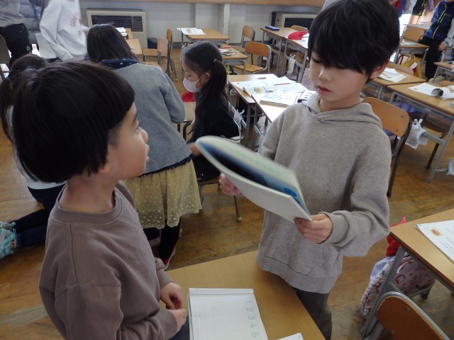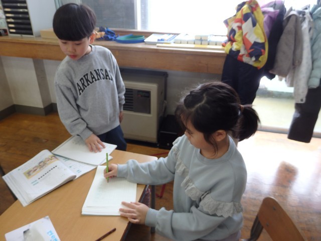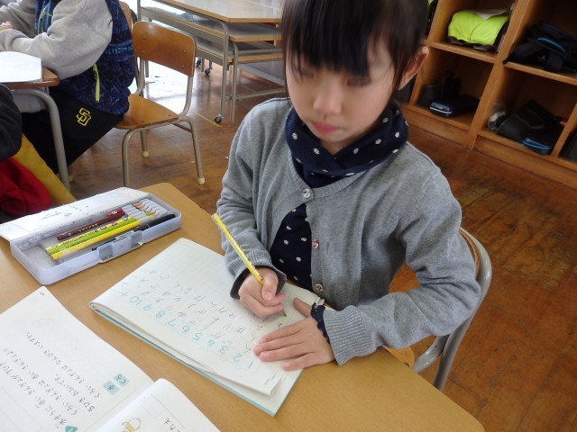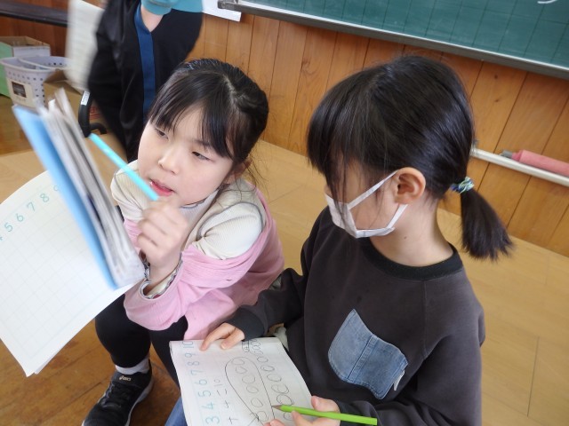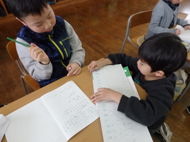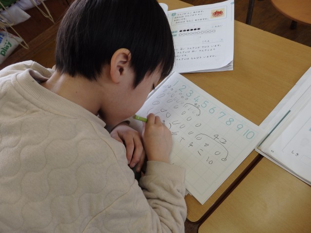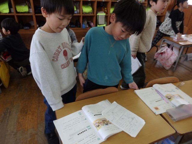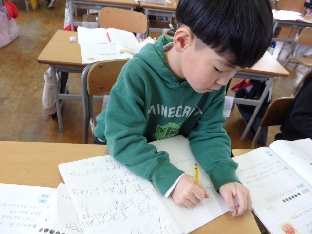 1年生の4時間目は算数の授業でした。「リンゴが6個あります。ミカンはリンゴより4個多いです。ミカンは何個ありますか」という問題に取り組んでいました。前の授業で学習したように、まずは図を描いてから式を考えました。式ができて答えも出せた子は、他のこと確かめ合ったり、困っている子に教えてあげたりしました。「みんなで協力して、全員が分かるようになる」ことが目標です。