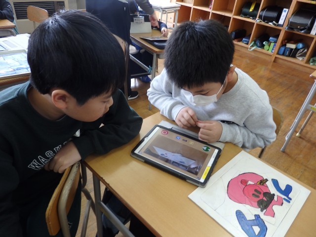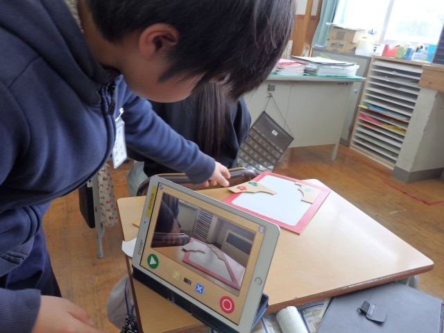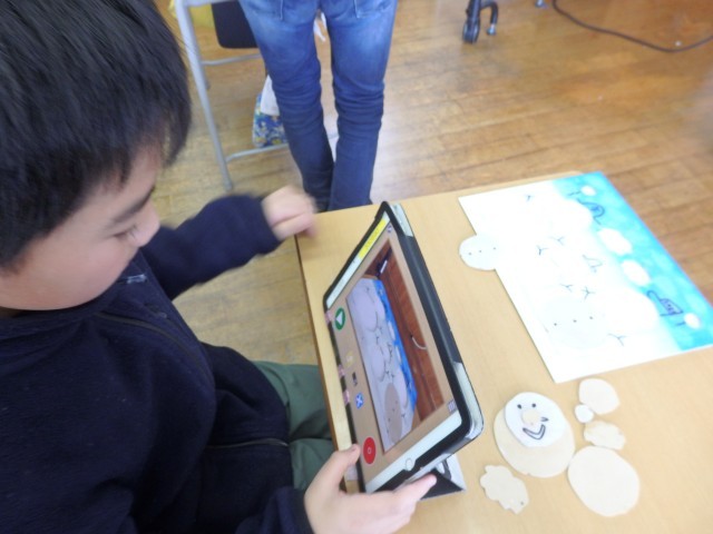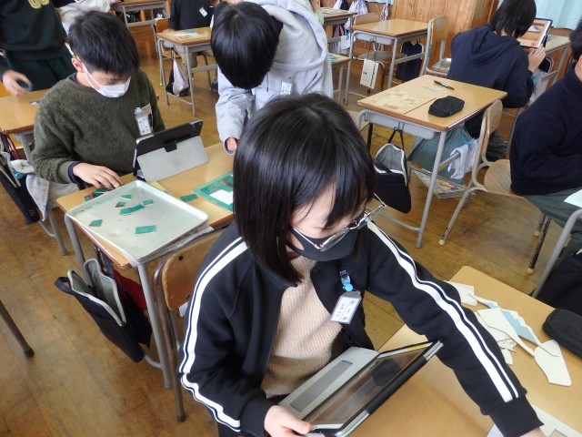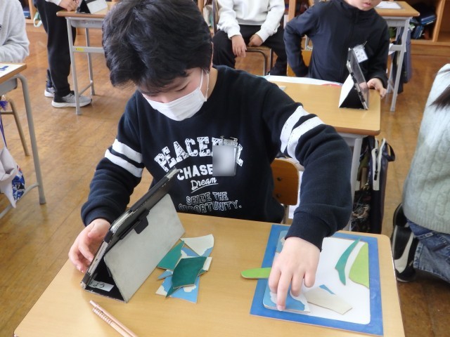 5年生の4時間目は図工の授業でした。これまで作っていた木材を切り分けて作ったパズルを活用して、コマ撮り動画を作りました。今まで何回か作ったことがありますので、慣れている5年生です。かなりのこだわりをもって作っていました。ちょっと動かしては撮影、またちょっと動かして撮影・・・を繰り返し、コマ数が数百コマ! 700コマ、900コマという大作を作った子がいました。