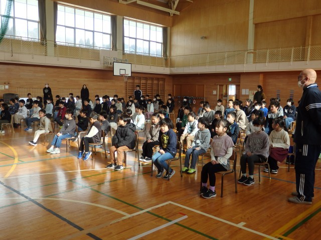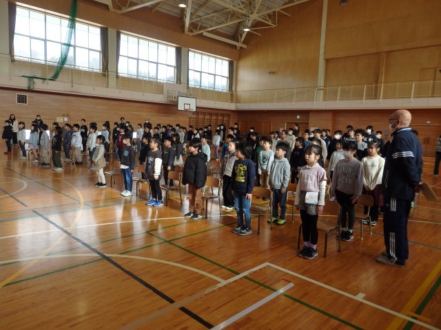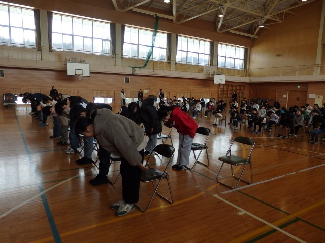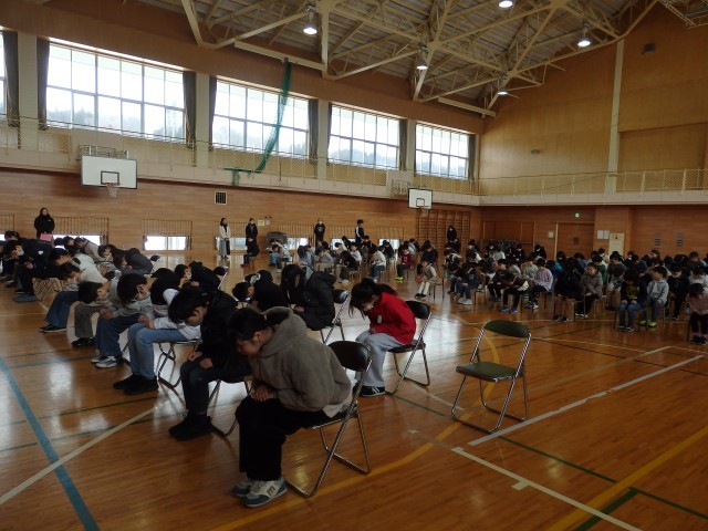 1時間目に全校で卒業式練習を行いました。まずは座るときの姿勢、式の中で行う座礼や敬礼の練習を行いました。
