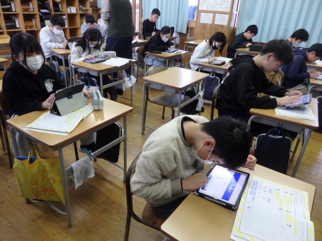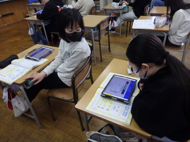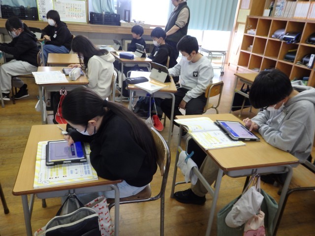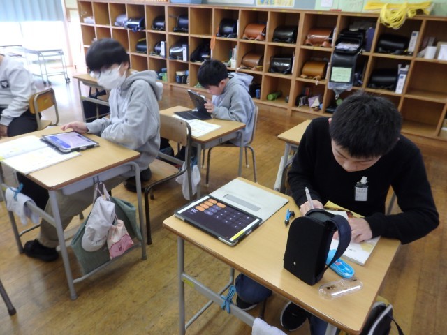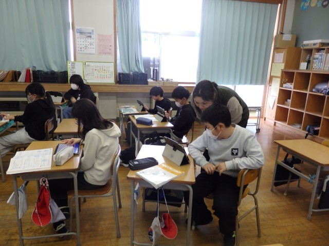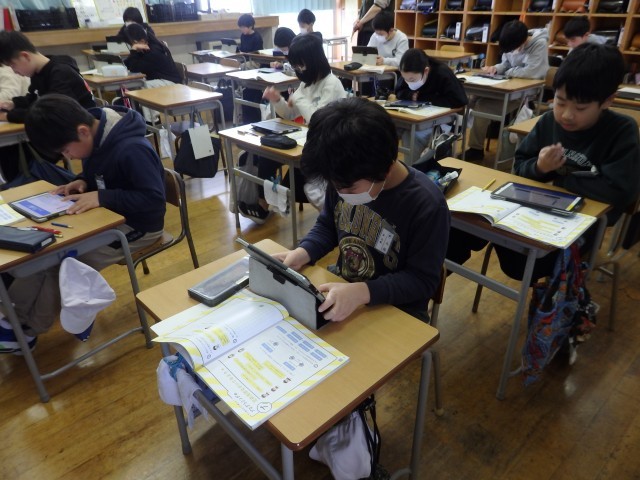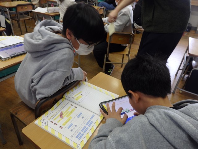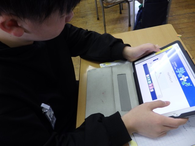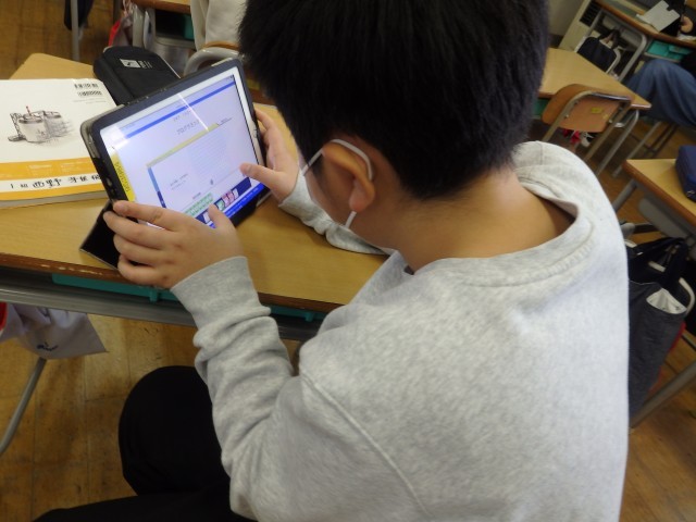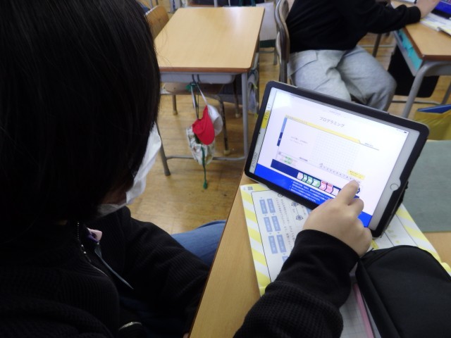 5年生の2時間目は算数の授業でした。「正多角形」の学習です。教科書に載っているQRコードを読み込んで立ち上げたアプリを使って、プログラミング学習も兼ねて行いました。「○センチ前に進む」、「○°右/左に曲がる」というコマンドを入力して、いろいろな正多角形を描いていきました。「正多角形の1つの角の大きさ」という基本を理解している必要があります。また、内容や順番も正しくコマンドを入力しないと図形が完成しません。とても集中して取り組んでいました。