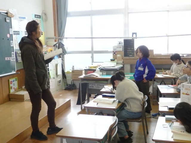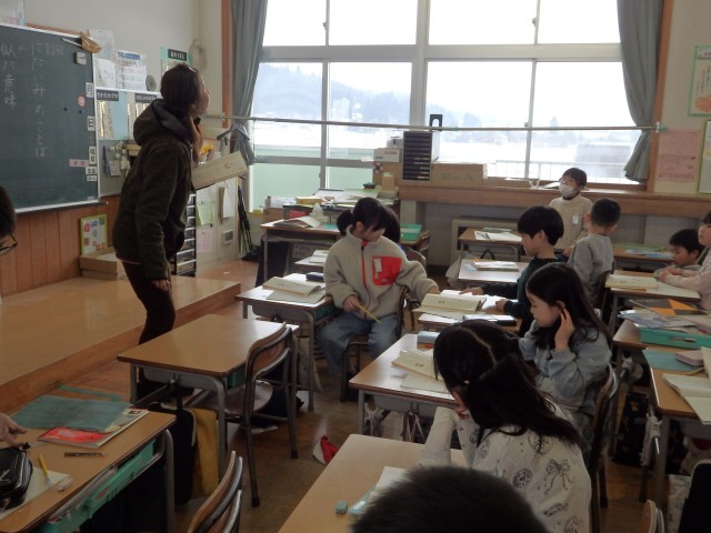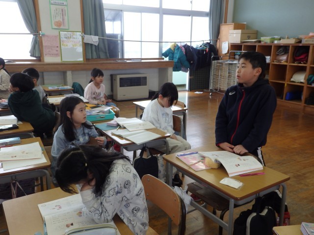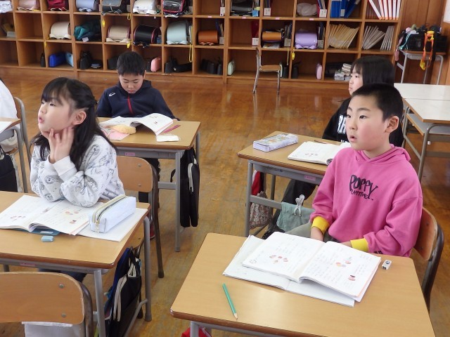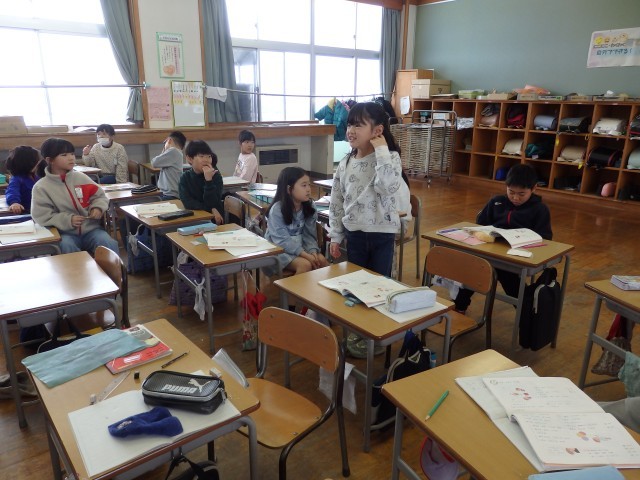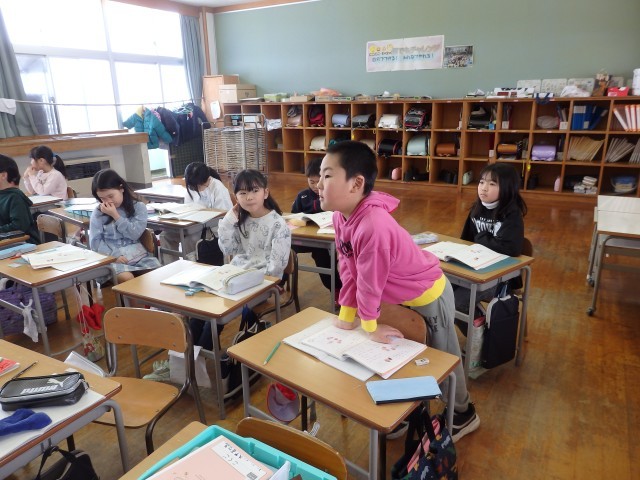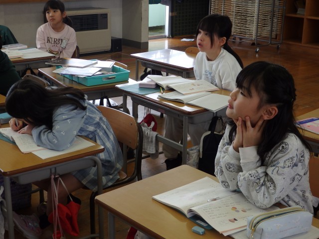 2年生の2時間目は国語の授業でした。「似た意味のことば」の学習です。「たくさん」、「見る」、「つかむ」と同じような意味の言葉を考えたり、「おどろく」と「びっくりする」はどう違うのかを考えました。「【驚く】は文で書くときに使って、【びっくりする】は話すときに使う」、「【びっくりする】は前のめりになる感じで、【驚く】はのけぞる感じ」など、聞いていて「なるほど!」と思うような考えが出されました。