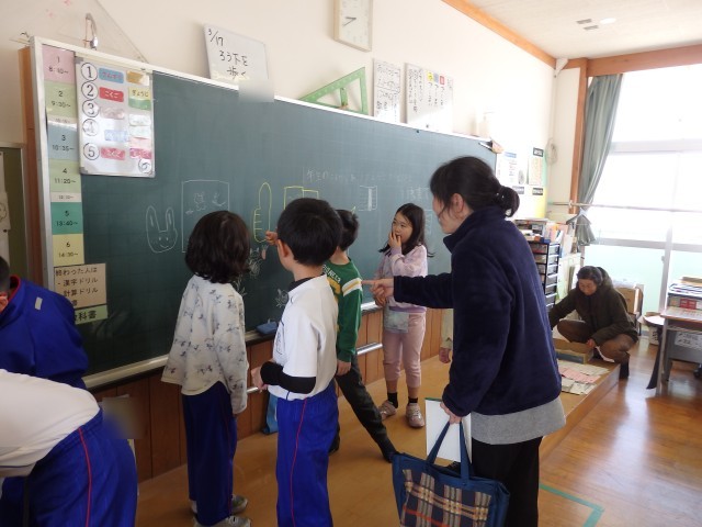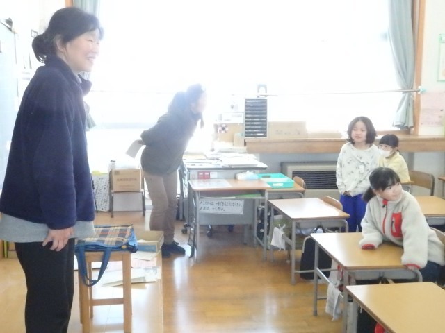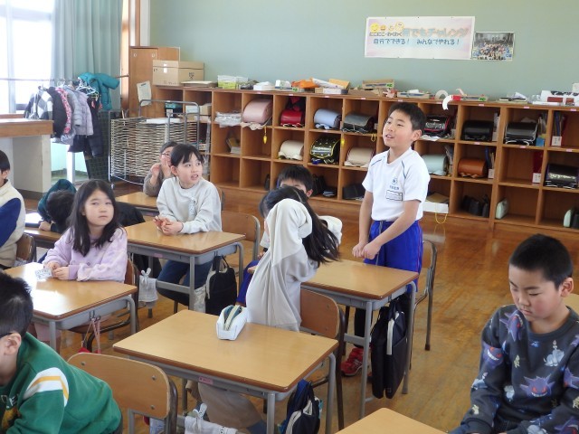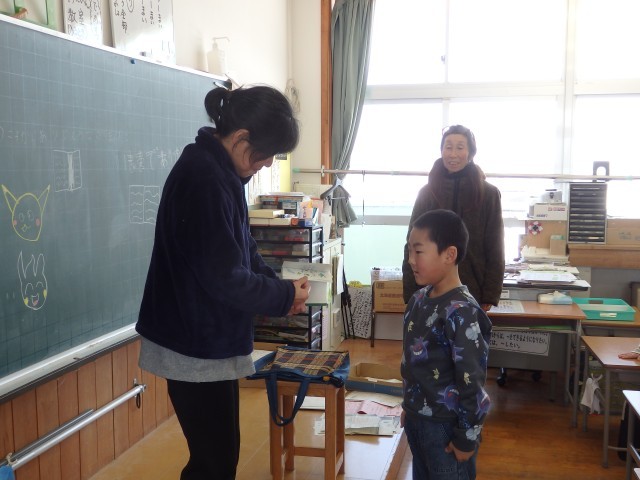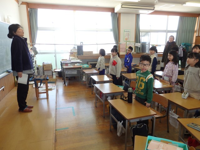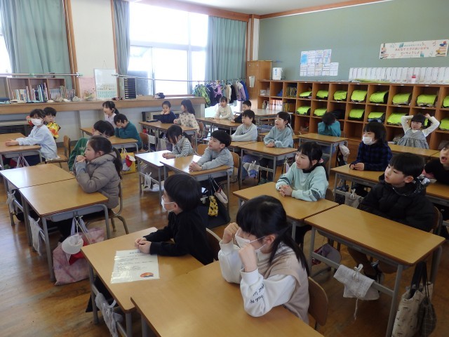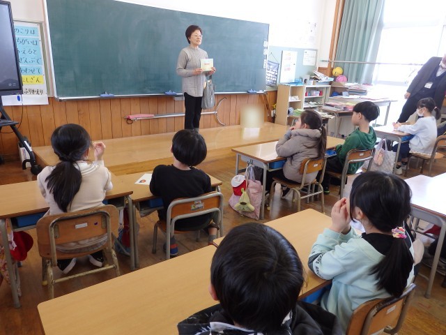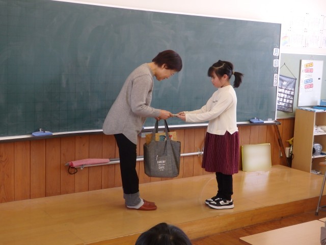 1,2年生の読み聞かせ、最後に子どもたち1人1人が書いたお礼のメッセージを代表の子がお渡ししました。読み聞かせを卒業する2年生は代表の子2人が感想とお礼の言葉を伝えました。最後に1年生も2年生も大きな声で「ありがとうございました!」