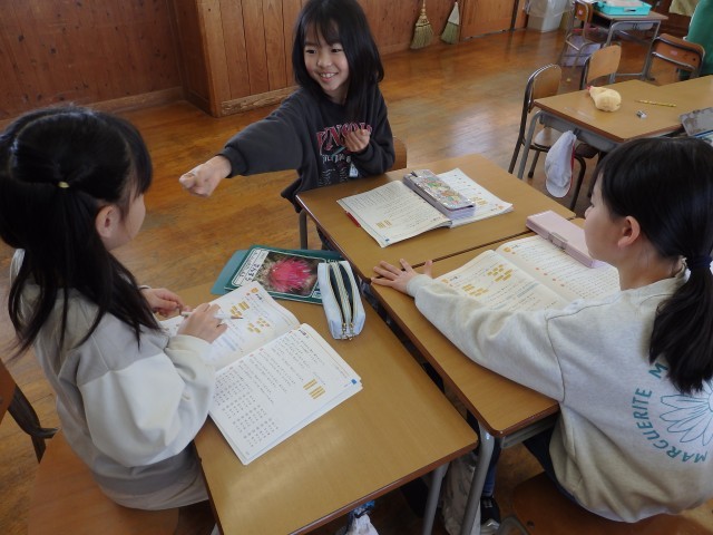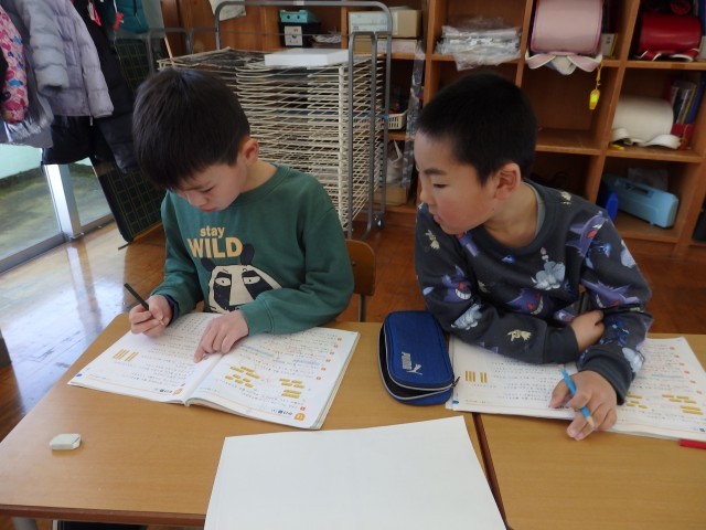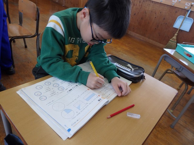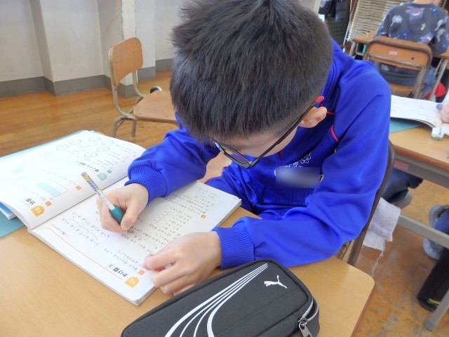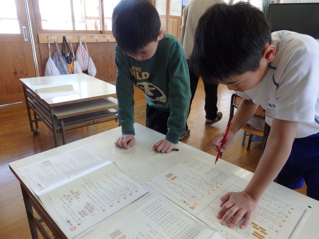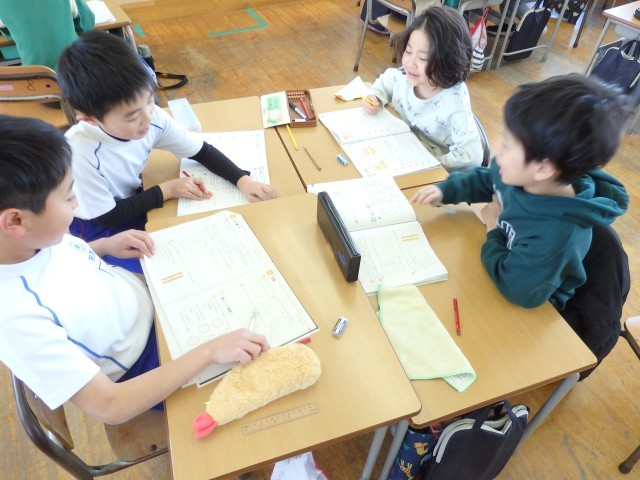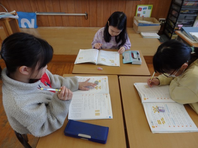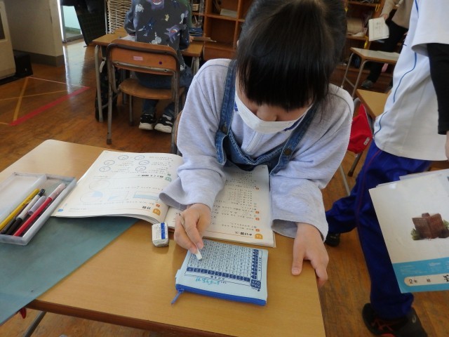 2年生の1時間目は算数の授業でした。2年生で学習した内容の総まとめです。教科書巻末の補充問題に取り組んでいました。友だちと教え合いながら取り組みたい人は机を合わせて、1人でじっくり考えて取り組みたい人は1人で取り組みます。1ページやり終えるごとに、自分で丸付けをしました。算数は積み上げの教科と言われます。2年生で習った九九やかけ算、図形などをしっかり身に付けて3年生になってほしいです。