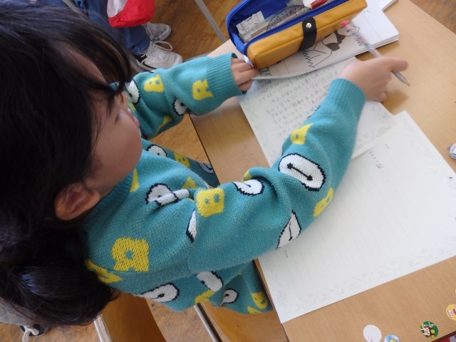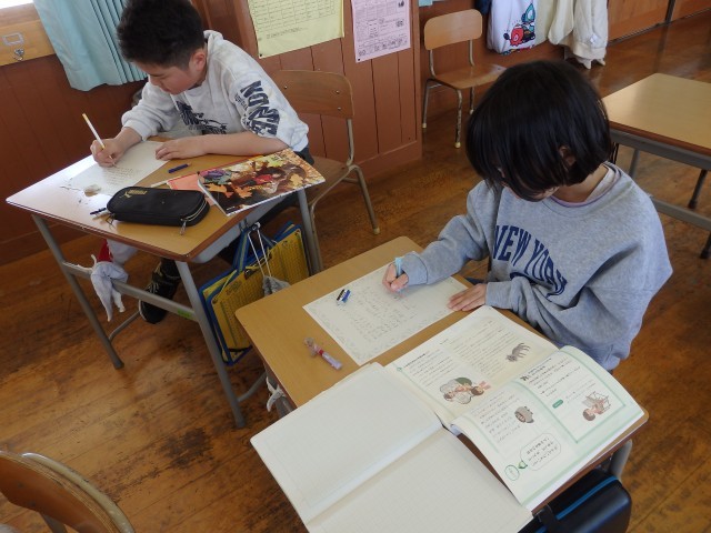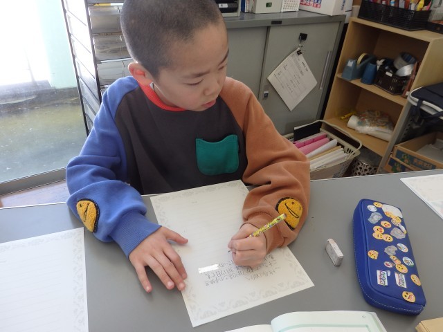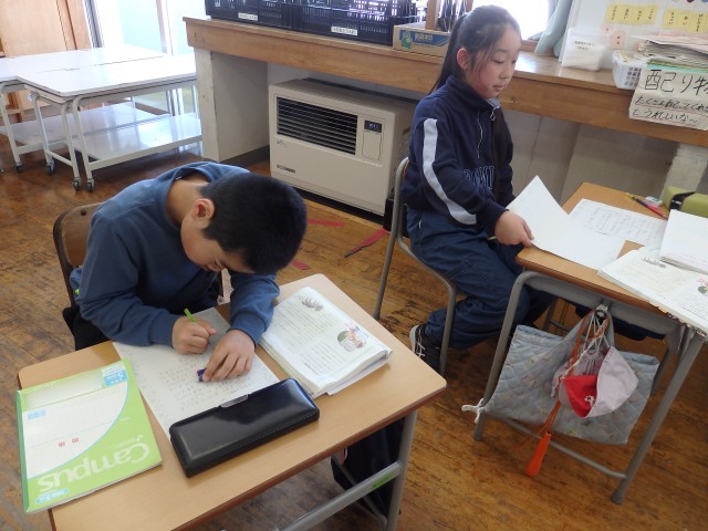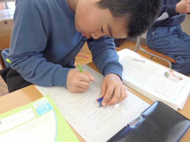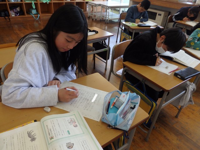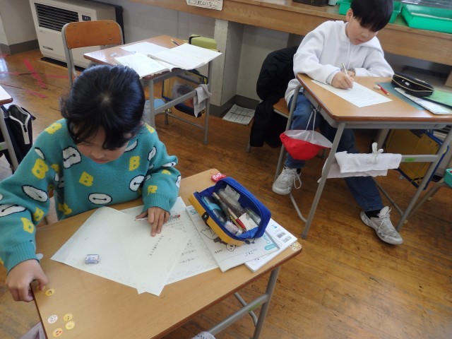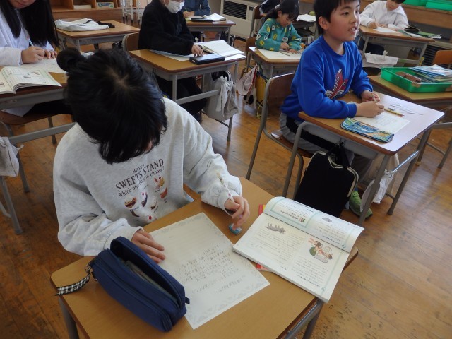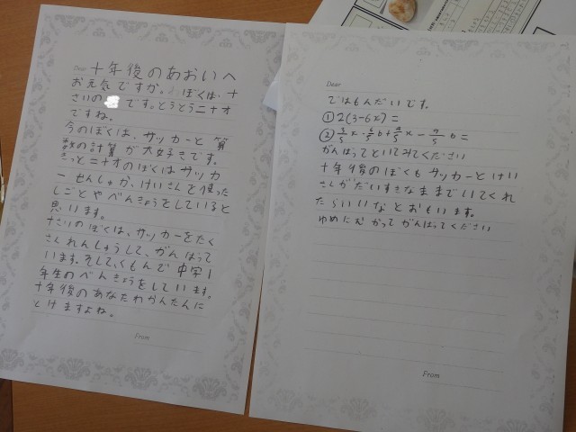 4年生の3時間目は国語の授業でした。「10年後の私へ」の学習です。20歳になった未来の自分へ宛てて手紙を書きました。そんな歌がありましたね、きっと素直な気持ちを打ち明けられたことでしょう。サッカー、計算、絵を描くこと、歌うこと、服のデザインなど「今、頑張っていること」や20歳の自分が「こうなっていたらいいな」という願いを書きました。中には20歳の自分に算数の問題を出した子がいました。さあ、未来の自分は解けるでしょうか。