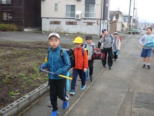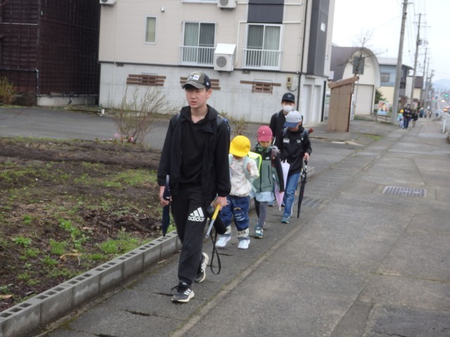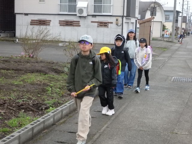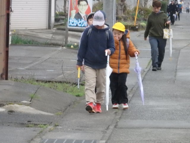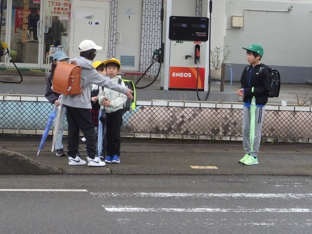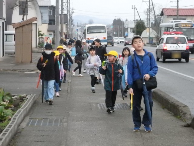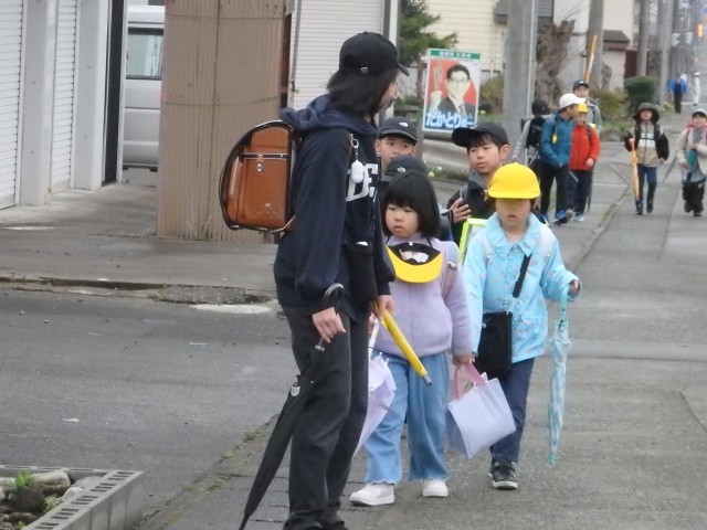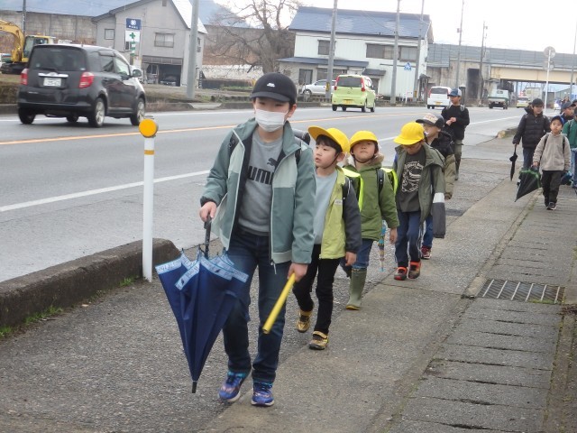 朝あの登校風景です。今日から1年生も一緒に登校します、1年生がついて来られるかどうか時々後ろを向いて確認したり、横断歩道での待ち方を教えてあげたりしながら登校班の先頭を歩く6年生の姿が素晴らしかったです。